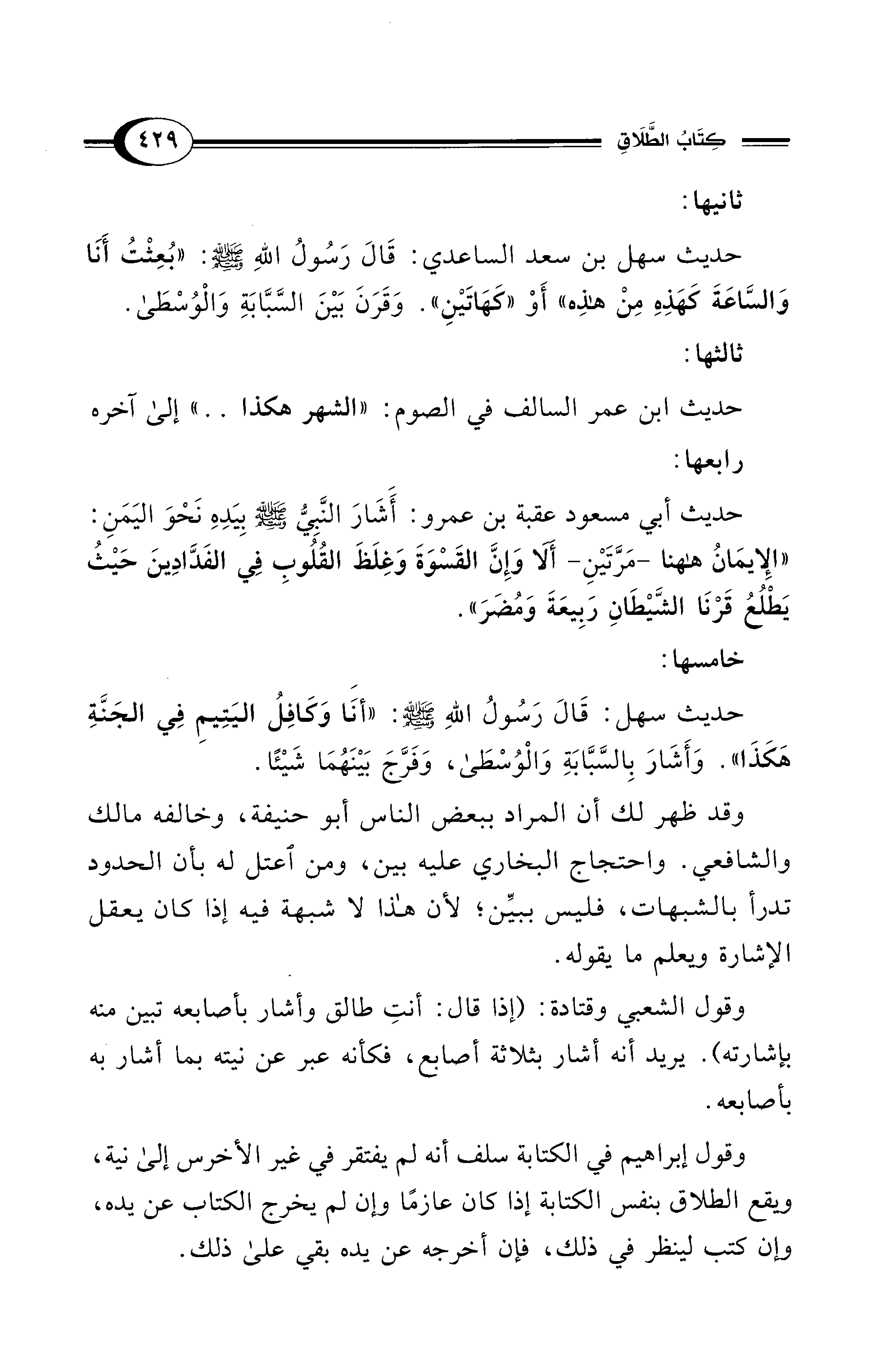 وقول الشعبي وقتادة: (إذا قال: أنتِ طالق وأشار بأصابعه تبين منه بإشارته). يريد أنه أشار بثلاثة أصابع، فكأنه عبر عن نيته بما أشار به بأصابعه.