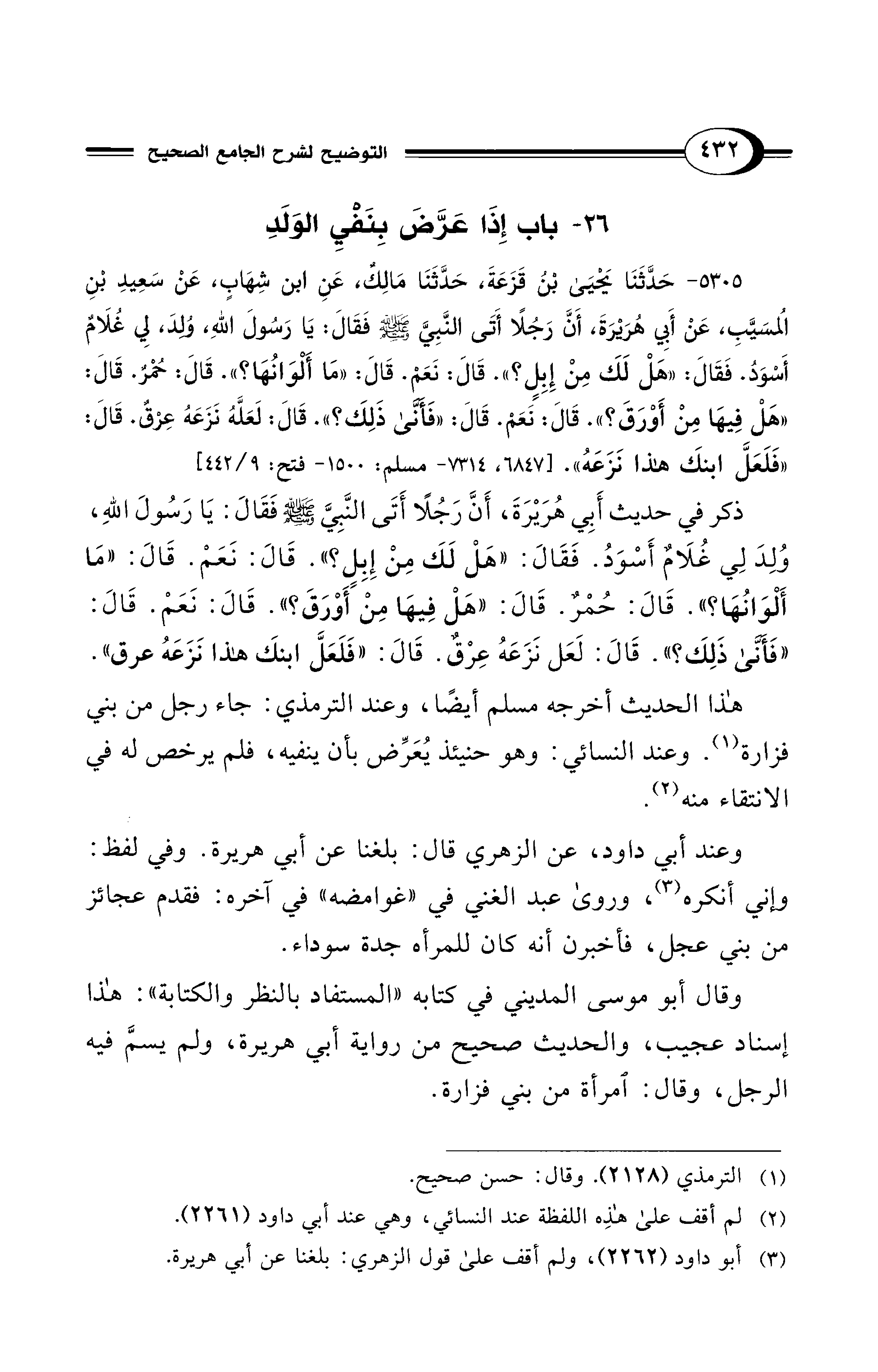 ذكر في حديث أَبِي هُرَيْرَةَ، أَنَّ رَجُلًا أَتَى النَّبِيَّ - صلى الله عليه وسلم - فَقَالَ: يَا رَسُولَ اللهِ، وُلِدَ لِي غُلَام أَسْوَدُ. فَقَالَ: "هَلْ لَكَ مِنْ إِبِلٍ؟ ". قَالَ: نَعَمْ. قَالَ: "مَا أَلْوَانُهَا؟ ". قَالَ: حُمْرٌ. قَالَ: "هَل فِيهَا مِنْ أَوْرَقَ؟ ". قَالَ: نَعَمْ. قَالَ: "فَأنّى ذَلِكَ؟ ". قَالَ: لَعَل نَزَعَهُ عِرْقٌ. قَالَ: "فَلَعَلَّ ابنكَ هذا نَزَعَهُ عرق".