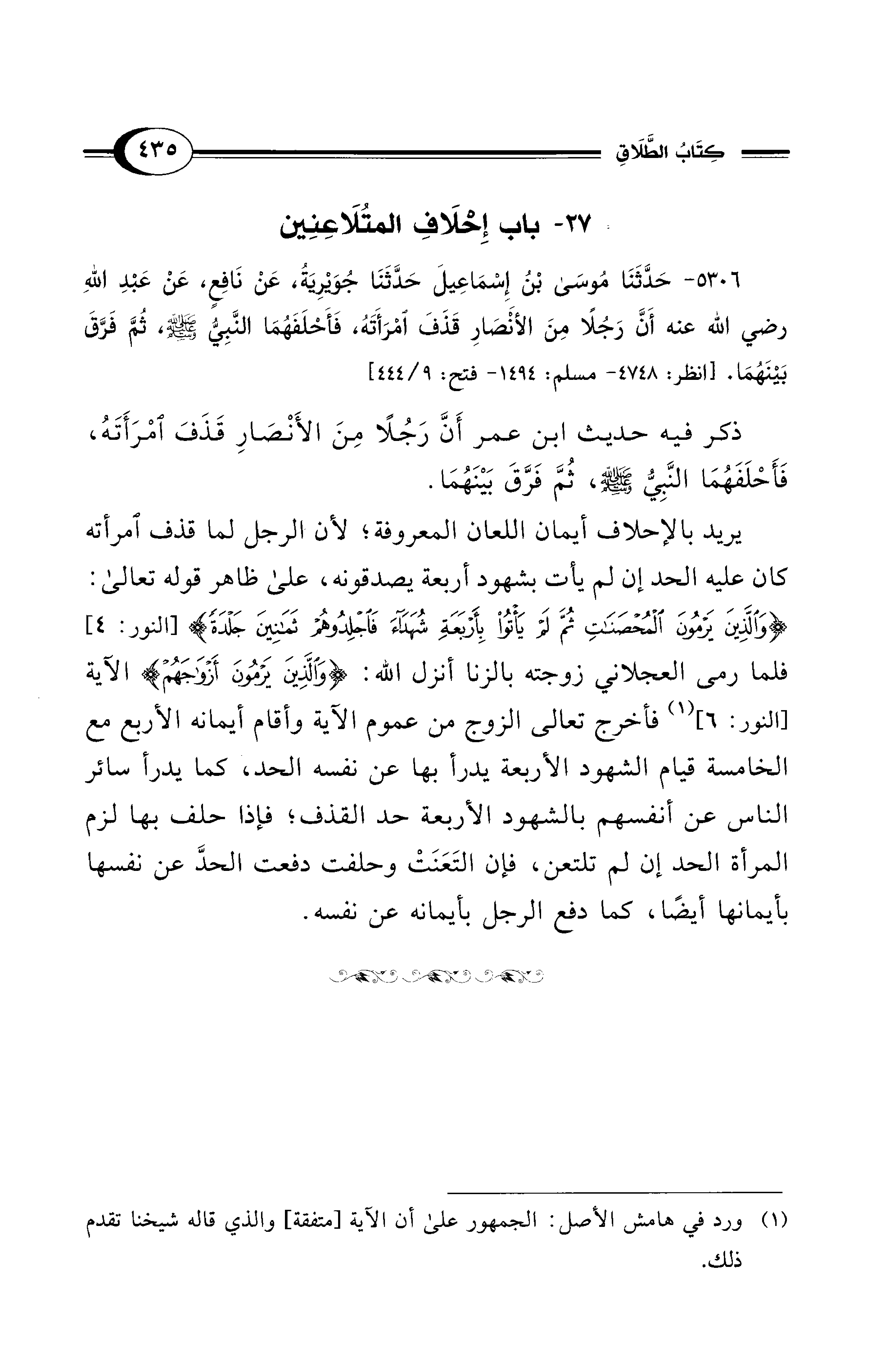 5306 - حَدَّثَنَا مُوسَى بْنُ إِسْمَاعِيلُ حَدَّثَنَا جُوَيْرِيَةُ, عَنْ نَافِعٍ, عَنْ عَبْدِ اللهِ - رضي الله عنه - أَنَّ رَجُلاً مِنَ الأَنْصَارِ قَذَفَ امْرَأَتَهُ, فَأَحْلَفَهُمَا النَّبِيُّ - صلى الله عليه وسلم -, ثُمَّ فَرَّقَ بَيْنَهُمَا. [انظر: 4748 - مسلم: 1494 - فتح 9/ 444].