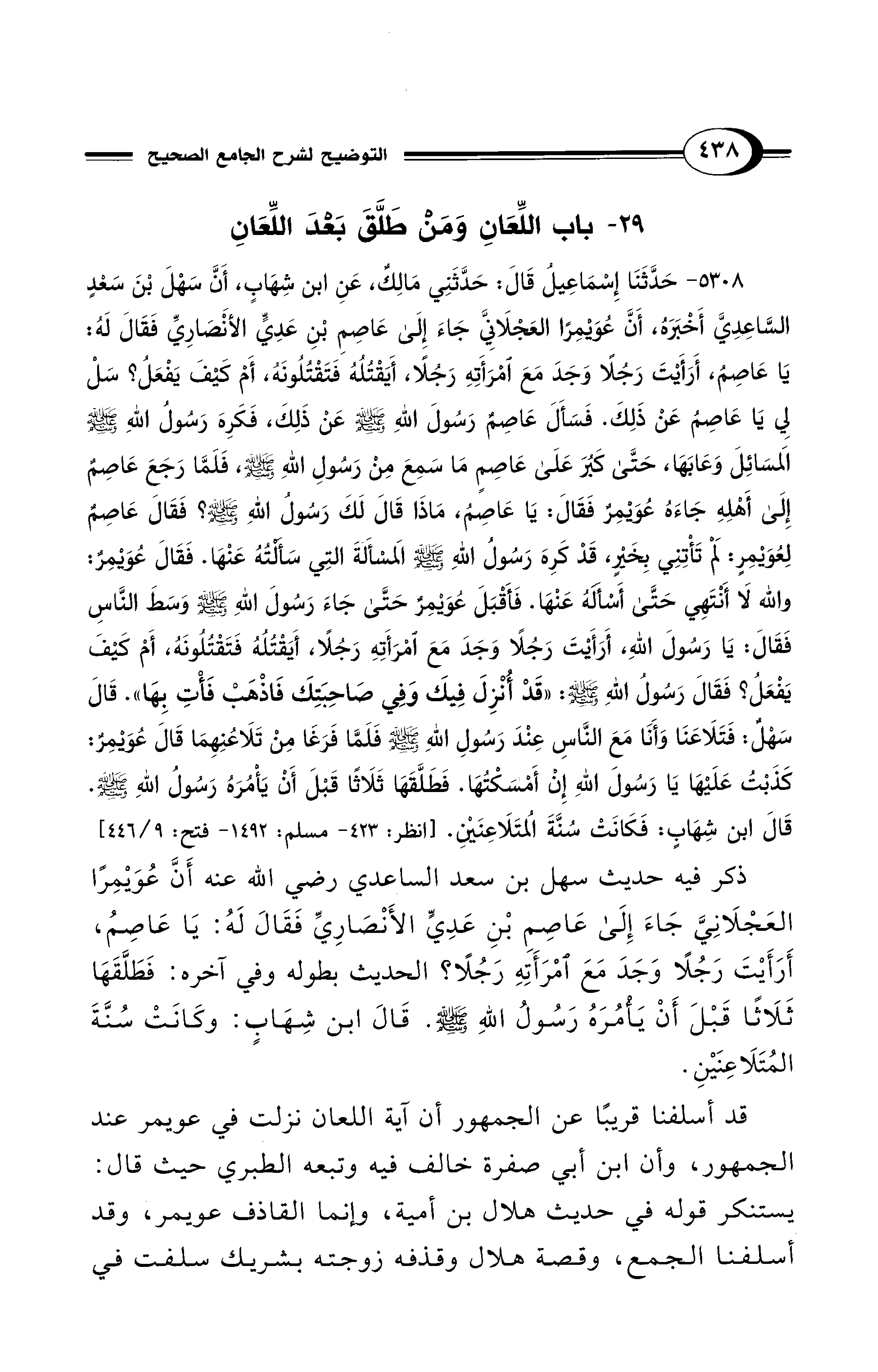 5308 - حَدَّثَنَا إِسْمَاعِيلُ قَالَ: حَدَّثَنِي مَالِكٌ, عَنِ ابْنِ شِهَابٍ, أَنَّ سَهْلَ بْنَ سَعْدٍ السَّاعِدِيَّ أَخْبَرَهُ, أَنَّ عُوَيْمِرًا الْعَجْلاَنِيَّ جَاءَ إِلَى عَاصِمِ بْنِ عَدِىٍّ الأَنْصَارِيِّ فَقَالَ لَهُ: يَا عَاصِمُ, أَرَأَيْتَ رَجُلاً وَجَدَ مَعَ امْرَأَتِهِ رَجُلاً، أَيَقْتُلُهُ فَتَقْتُلُونَهُ، أَمْ كَيْفَ يَفْعَلُ؟ سَلْ لِي يَا عَاصِمُ عَنْ ذَلِكَ. فَسَأَلَ عَاصِمٌ رَسُولَ اللهِ - صلى الله عليه وسلم - عَنْ ذَلِكَ, فَكَرِهَ رَسُولُ اللهِ - صلى الله عليه وسلم - الْمَسَائِلَ وَعَابَهَا، حَتَّى كَبُرَ عَلَى عَاصِمٍ مَا سَمِعَ مِنْ رَسُولِ اللهِ - صلى الله عليه وسلم - فَلَمَّا رَجَعَ عَاصِمٌ إِلَى أَهْلِهِ جَاءَهُ عُوَيْمِرٌ فَقَالَ: يَا عَاصِمُ, مَاذَا قَالَ لَكَ رَسُولُ اللهِ - صلى الله عليه وسلم -؟ فَقَالَ عَاصِمٌ لِعُوَيْمِرٍ: لَمْ تَأْتِنِي بِخَيْرٍ، قَدْ كَرِهَ رَسُولُ اللهِ - صلى الله عليه وسلم - الْمَسْأَلَةَ الَّتِل سَأَلْتُهُ عَنْهَا. فَقَالَ عُوَيْمِرٌ: وَاللهِ لاَ أَنْتَهِي حَتَّى أَسْأَلَهُ عَنْهَا. فَأَقْبَلَ عُوَيْمِرٌ حَتَّى جَاءَ رَسُولَ اللهِ - صلى الله عليه وسلم - وَسَطَ النَّاسِ فَقَالَ: يَا رَسُولَ اللهِ, أَرَأَيْتَ رَجُلاً وَجَدَ مَعَ امْرَأَتِهِ رَجُلاً، أَيَقْتُلُهُ فَتَقْتُلُونَهُ أَمْ كَيْفَ يَفْعَلُ؟ فَقَالَ رَسُولُ اللهِ - صلى الله عليه وسلم -: «قَدْ أُنْزِلَ فِيكَ وَفِي صَاحِبَتِكَ فَاذْهَبْ فَأْتِ بِهَا». قَالَ سَهْلٌ: فَتَلاَعَنَا وَأَنَا مَعَ النَّاسِ عِنْدَ رَسُولِ اللهِ - صلى الله عليه وسلم - فَلَمَّا فَرَغَا مِنْ تَلاَعُنِهِمَا قَالَ عُوَيْمِرٌ: كَذَبْتُ عَلَيْهَا يَا رَسُولَ اللهِ إِنْ أَمْسَكْتُهَا. فَطَلَّقَهَا ثَلاَثًا قَبْلَ أَنْ يَأْمُرَهُ رَسُولُ اللهِ - صلى الله عليه وسلم -. قَالَ ابْنُ شِهَابٍ: فَكَانَتْ سُنَّةَ الْمُتَلاَعِنَيْنِ. [انظر: 423 - مسلم: 1492 - فتح 9/ 446].