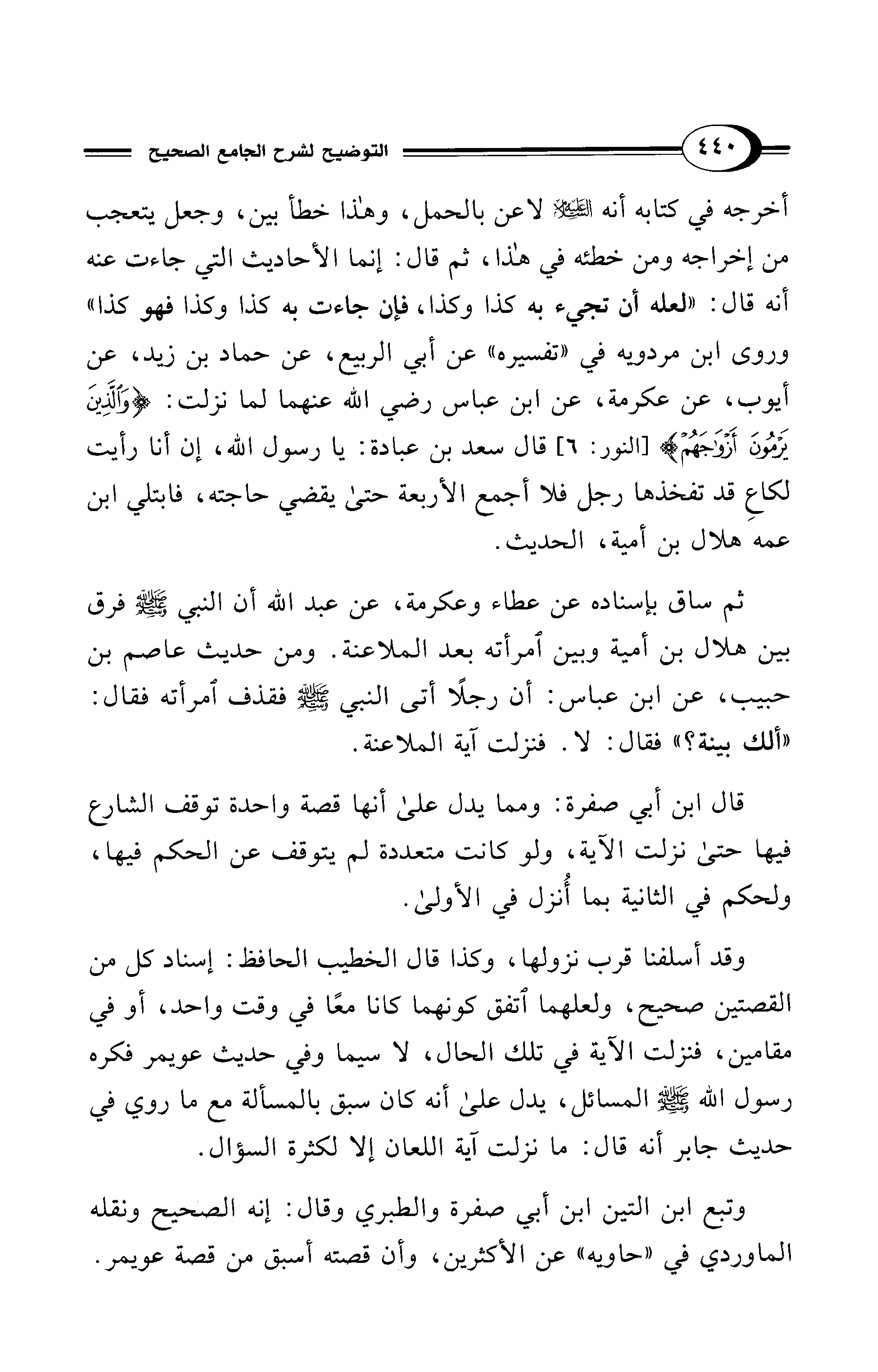 ثم ساق بإسناده عن عطاء وعكرمة، عن عبد الله أن النبي - صلى الله عليه وسلم - فرق بين هلال بن أمية وبين امرأته بعد الملاعنة. ومن حديث عاصم بن حبيب، عن ابن عباس: أن رجلاً أتى النبي - صلى الله عليه وسلم - فقذف امرأته فقال: "ألك بينة؟ " فقال: لا. فنزلت آية الملاعنة.