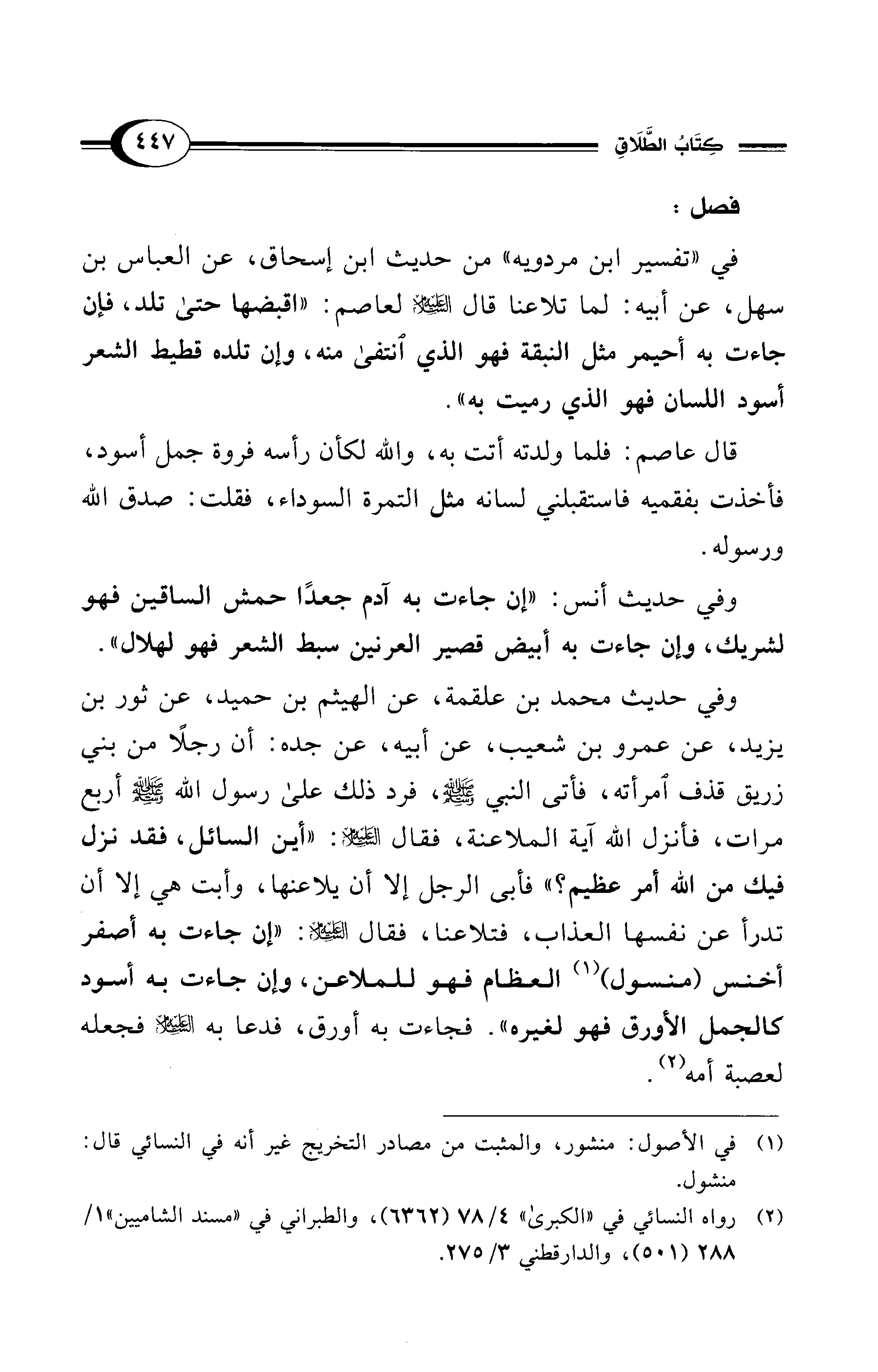 وفي حديث محمد بن علقمة، عن الهيثم بن حميد، عن ثور بن يزيد، عن عمرو بن شعيب، عن أبيه، عن جده: أن رجلاً من بني زريق قذف امرأته، فأتى النبي - صلى الله عليه وسلم -، فرد ذلك على رسول الله - صلى الله عليه وسلم - أربع مرات، فأنزل الله آية الملاعنة، فقال - عليه السلام -: "أين السائل، فقد نزل فيك من الله أمر عظيم؟ " فأبى الرجل إلا أن يلاعنها، وأبت هي إلا أن تدرأ عن نفسها العذاب، فتلاعنا، فقال - عليه السلام -: "إن جاءت به أصفر أخنس (منسول) (¬1) العظام فهو للملاعن، وإن جاءت به أسود كلالجمل الأورق فهو لغيره". فجاءت به أورق، فدعا به - عليه السلام - فجعله لعصبة أمه (¬2).