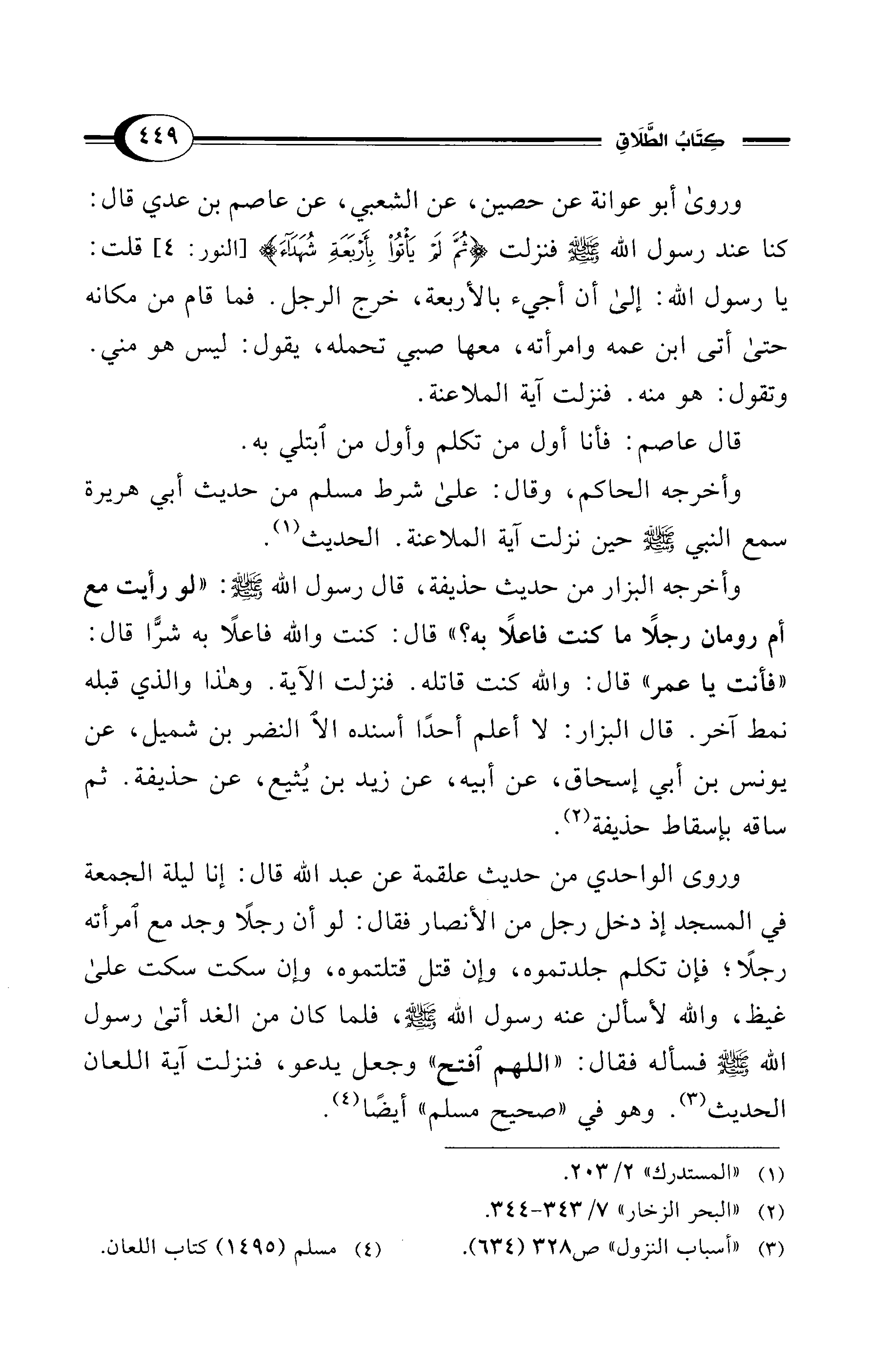 وروى أبو عوانة عن حصين، عن الشعبي، عن عاصم بن عدي قال: كنا عند رسول الله - صلى الله عليه وسلم - فنزلت {ثُمَّ لَمْ يَأْتُوا بِأَرْبَعَةِ شُهَدَاءَ} [النور: 4] قلت: يا رسول الله: إلى أن أجيء بالأربعة، خرج الرجل. فما قام من مكانه حتى أتى ابن عمه وامرأته، معها صبي تحمله، يقول: ليس هو مني. وتقول: هو منه. فنزلت آية الملاعنة.