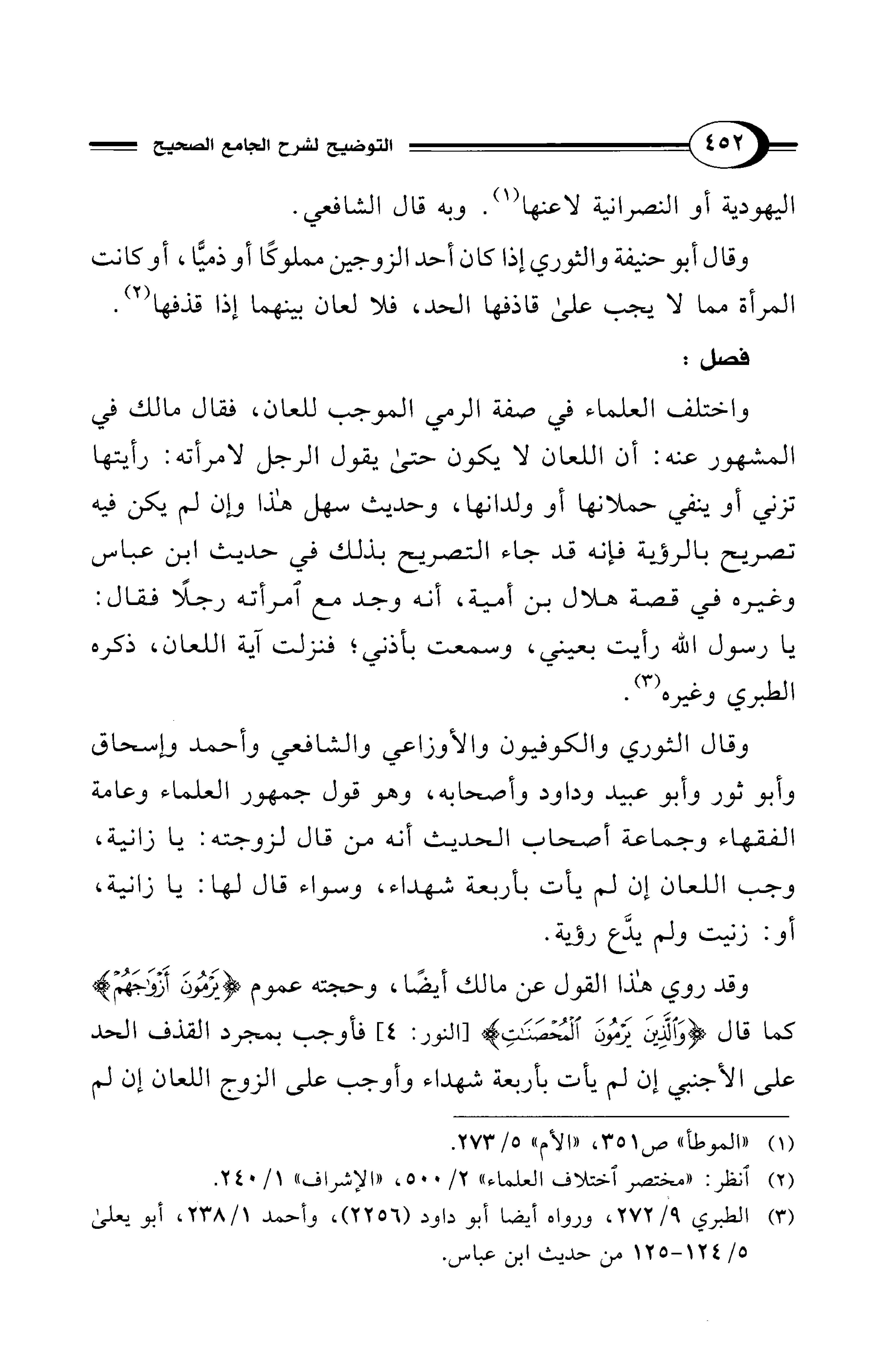 واختلف العلماء في صفة الرمي الموجب للعان، فقال مالك في المشهور عنه: أن اللعان لا يكون حتى يقول الرجل لامرأته: رأيتها تزني أو ينفي حملانها أو ولدانها، وحديث سهل هذا وإن لم يكن فيه تصريح بالرؤية فإنه قد جاء التصريح بذلك في حديث ابن عباس وغيره في قصة هلال بن أمية، أنه وجد مع امرأته رجلاً فقال: يا رسول الله رأيت بعيني، وسمعت بأذني؛ فنزلت آية اللعان، ذكره الطبري وغيره (¬3).