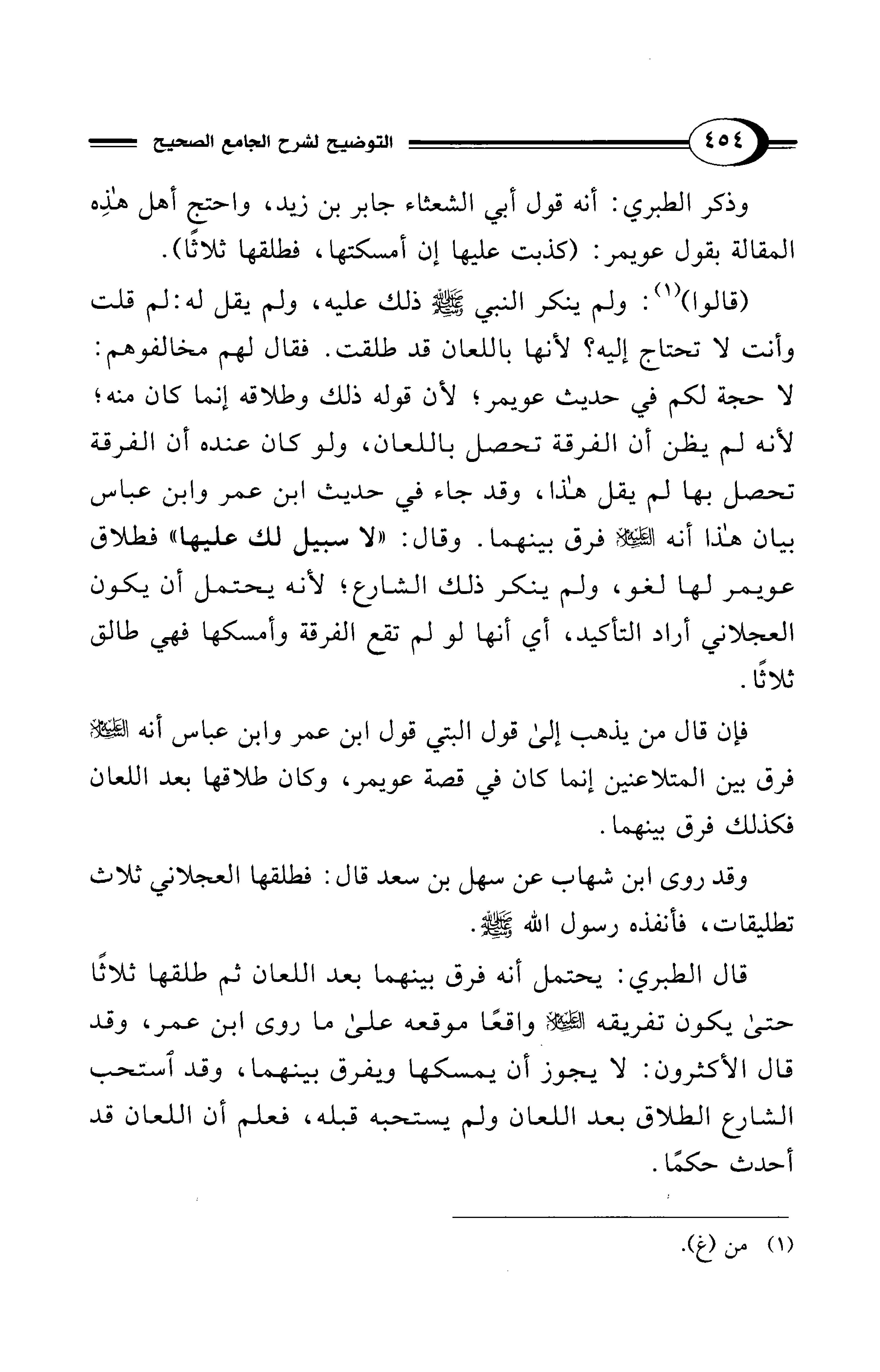 (قالوا) (¬1): ولم ينكر النبي - صلى الله عليه وسلم - ذلك عليه، ولم يقل له: لم قلت وأنت لا تحتاج إليه؟ لأنها باللعان قد طلقت. فقال لهم مخالفوهم: لا حجة لكم في حديث عويمر؛ لأن قوله ذلك وطلاقه إنما كان منه؛ لأنه لم يظن أن الفرقة تحصل باللعان، ولو كان عنده أن الفرقة تحصل بها لم يقل هذا، وقد جاء في حديث ابن عمر وابن عباس بيان هذا أنه - عليه السلام - فرق بينهما. وقال: "لا سبيل لك عليها" فطلاق عويمر لها لغو، ولم ينكر ذلك الشارع؛ لأنه يحتمل أن يكون العجلاني أراد التأكيد، أي أنها لو لم تقع الفرقة وأمسكها فهي طالق ثلاثًا.