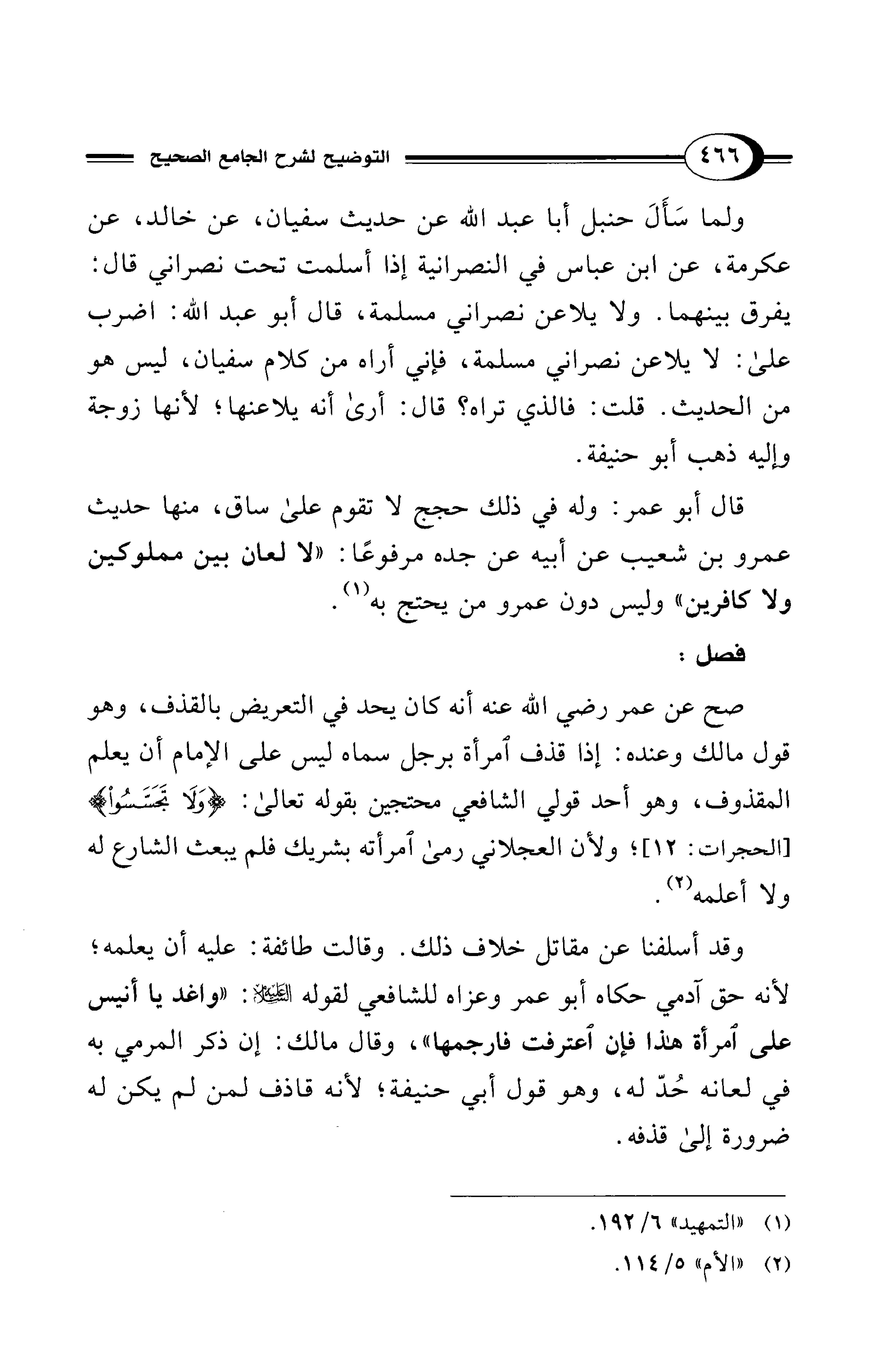 ولما سَأَلَ حنبل أبا عبد الله عن حديث سفيان، عن خالد، عن عكرمة، عن ابن عباس في النصرانية إذا أسلمت تحت نصراني قال: يفرق بينهما. ولا يلاعن نصراني مسلمة، قال أبو عبد الله: اضرب على: لا يلاعن نصراني مسلمة، فإني أراه من كلام سفيان، ليس هو من الحديث. قلت: فالذي تراه؟ قال: أرى أنه يلاعنها؛ لأنها زوجة وإليه ذهب أبو حنيفة.