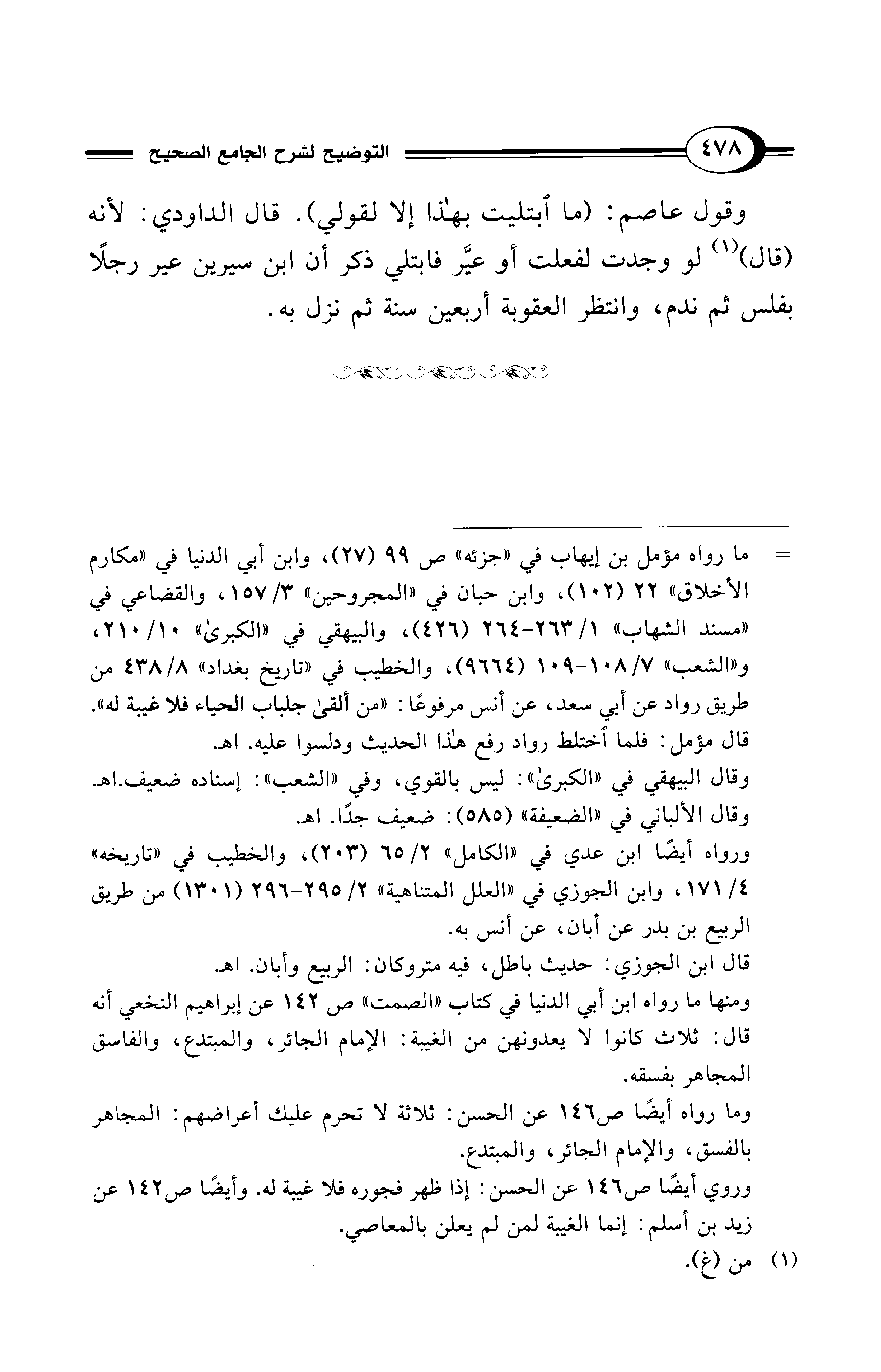 وما رواه أيضًا ص 146 عن الحسن: ثلاثة لا تحرم عليك أعراضهم: المجاهر بالفسق، والإمام الجائر، والمبتدع.