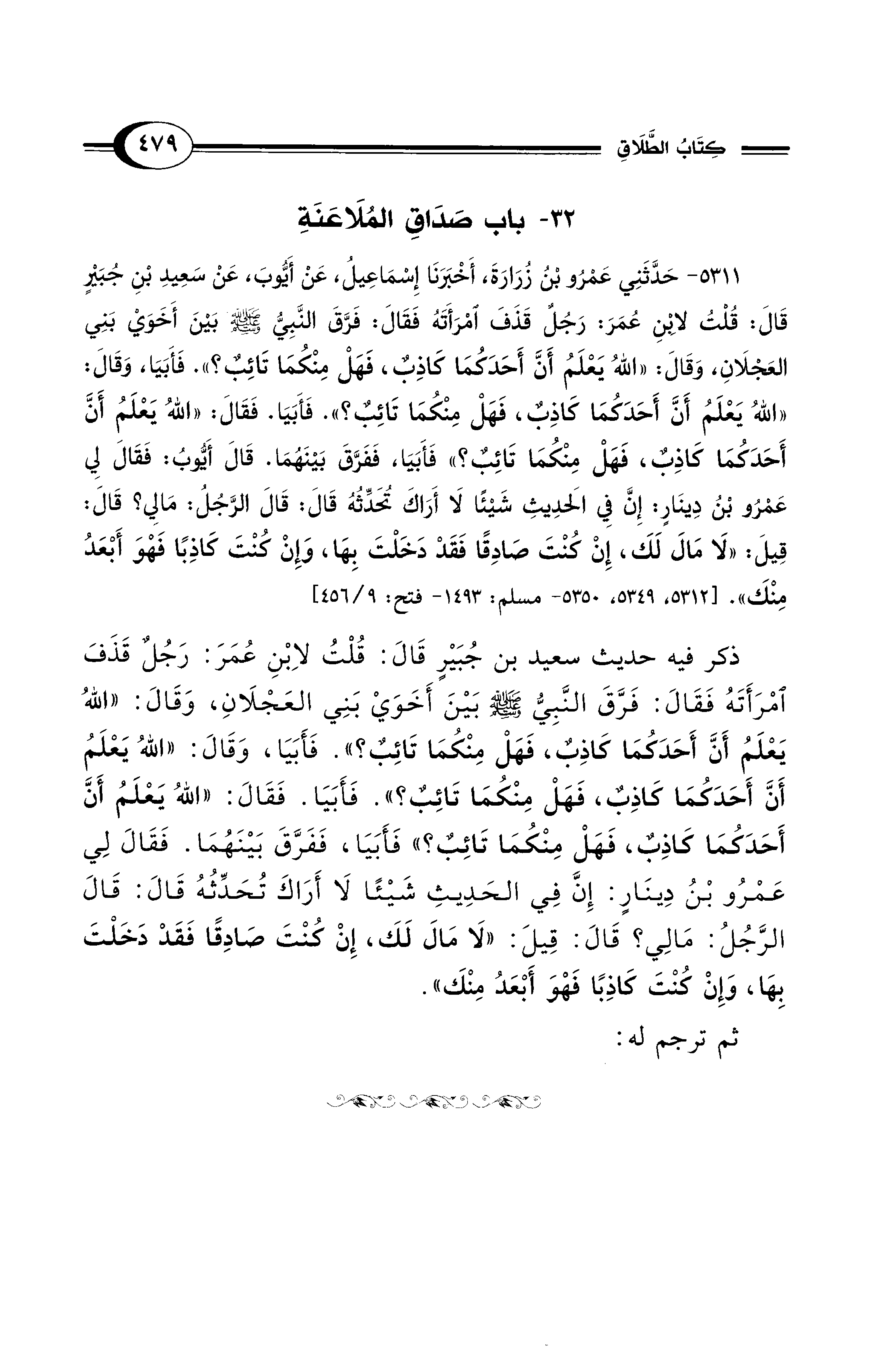 5311 - حَدَّثَنِي عَمْرُو بْنُ زُرَارَةَ, أَخْبَرَنَا إِسْمَاعِيلُ, عَنْ أَيُّوبَ, عَنْ سَعِيدِ بْنِ جُبَيْرٍ قَالَ: قُلْتُ لاِبْنِ عُمَرَ: رَجُلٌ قَذَفَ امْرَأَتَهُ فَقَالَ: فَرَّقَ النَّبِيُّ - صلى الله عليه وسلم - بَيْنَ أَخَوَىْ بَنِي الْعَجْلاَنِ، وَقَالَ: «اللهُ يَعْلَمُ أَنَّ أَحَدَكُمَا كَاذِبٌ، فَهَلْ مِنْكُمَا تَائِبٌ؟». فَأَبَيَا. وَقَالَ: «اللهُ يَعْلَمُ أَنَّ أَحَدَكُمَا كَاذِبٌ، فَهَلْ مِنْكُمَا تَائِبُ؟». فَأَبَيَا. فَقَالَ: «اللهُ يَعْلَمُ أَنَّ أَحَدَكُمَا كَاذِبٌ، فَهَلْ مِنْكُمَا تَائِبٌ؟» فَأَبَيَا فَفَرَّقَ بَيْنَهُمَا. قَالَ أَيُّوبُ: فَقَالَ لِي عَمْرُو بْنُ دِينَارٍ إِنَّ فِي الْحَدِيثِ شَيْئًا لاَ أَرَاكَ تُحَدِّثُهُ قَالَ: قَالَ الرَّجُلُ: مَالِي؟ قَالَ: قِيلَ: "لاَ مَالَ لَكَ، إِنْ كُنْتَ صَادِقًا فَقَدْ دَخَلْتَ بِهَا، وَإِنْ كُنْتَ كَاذِبًا فَهْوَ أَبْعَدُ مِنْكَ". [5312, 5349, 5350 - مسلم: 1493 - فتح 9/ 456].
