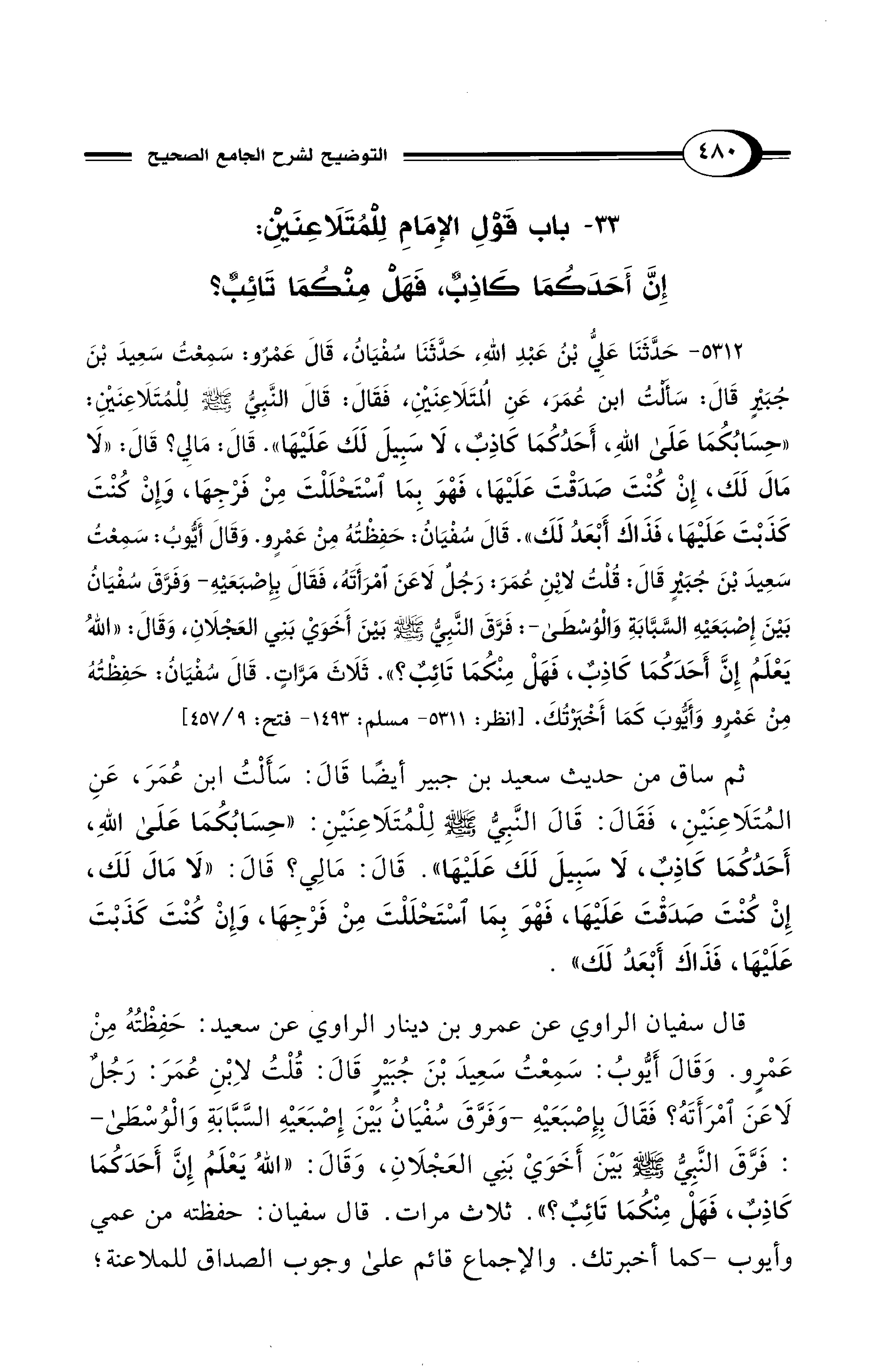 5312 - حَدَّثَنَا عَلِيُّ بْنُ عَبْدِ اللهِ, حَدَّثَنَا سُفْيَانُ, قَالَ عَمْرٌو: سَمِعْتُ سَعِيدَ بْنَ جُبَيْرٍ قَالَ: سَأَلْتُ ابْنَ عُمَرَ, عَنِ الْمُتَلاَعِنَيْنِ، فَقَالَ: قَالَ النَّبِيُّ - صلى الله عليه وسلم - لِلْمُتَلاَعِنَيْنِ: «حِسَابُكُمَا عَلَى اللهِ أَحَدُكُمَا كَاذِبٌ، لاَ سَبِيلَ لَكَ عَلَيْهَا». قَالَ: مَالِي؟ قَالَ: «لاَ مَالَ لَكَ، إِنْ كُنْتَ صَدَقْتَ عَلَيْهَا، فَهْوَ بِمَا اسْتَحْلَلْتَ مِنْ فَرْجِهَا، وَإِنْ كُنْتَ كَذَبْتَ عَلَيْهَا، فَذَاكَ أَبْعَدُ لَكَ». قَالَ سُفْيَانُ: حَفِظْتُهُ مِنْ عَمْرٍو. وَقَالَ أَيُّوبُ: سَمِعْتُ سَعِيدَ بْنَ جُبَيْرٍ قَالَ: قُلْتُ لاِبْنِ عُمَرَ: رَجُلٌ لاَعَنَ امْرَأَتَهُ, فَقَالَ بِإِصْبَعَيْهِ -وَفَرَّقَ سُفْيَانُ بَيْنَ إِصْبَعَيْهِ السَّبَّابَةِ وَالْوُسْطَى- فَرَّقَ النَّبِيُّ - صلى الله عليه وسلم - بَيْنَ أَخَوَيْ بَنِي الْعَجْلاَنِ، وَقَالَ: «اللهُ يَعْلَمُ إِنَّ أَحَدَكُمَا كَاذِبٌ, فَهَلْ مِنْكُمَا تَائِبٌ؟». ثَلاَثَ مَرَّاتٍ. قَالَ سُفْيَانُ: حَفِظْتُهُ مِنْ عَمْرٍو وَأَيُّوبَ كَمَا أَخْبَرْتُكَ. [انظر: 5311 - مسلم: 1493 - فتح 9/ 457].