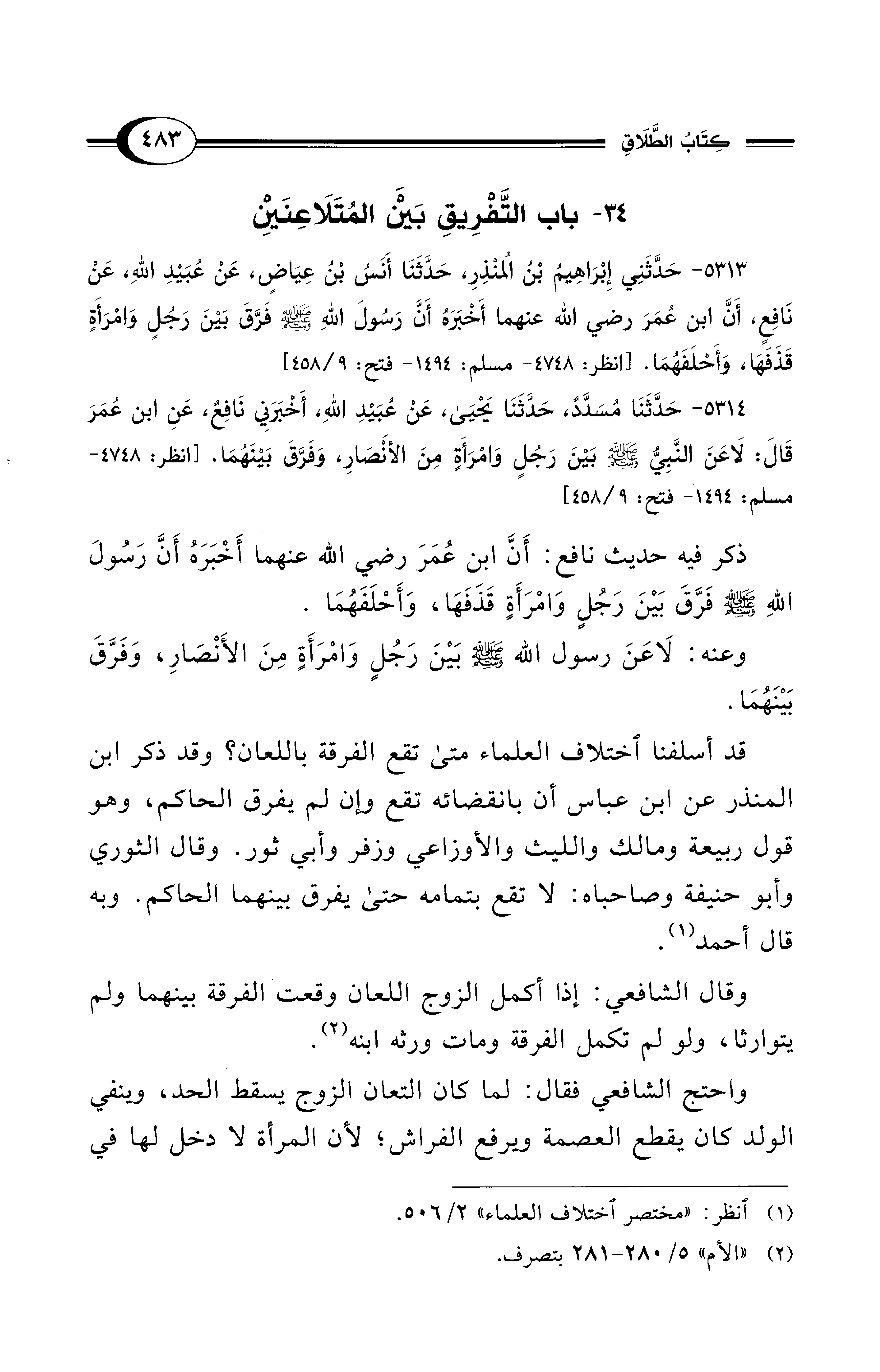 5314 - حَدَّثَنَا مُسَدَّدٌ, حَدَّثَنَا يَحْيَى, عَنْ عُبَيْدِ اللهِ, أَخْبَرَنِي نَافِعٌ, عَنِ ابْنِ عُمَرَ قَالَ: لاَعَنَ النَّبِيُّ - صلى الله عليه وسلم - بَيْنَ رَجُلٍ وَامْرَأَةٍ مِنَ الأَنْصَارِ، وَفَرَّقَ بَيْنَهُمَا. [انظر: 4748 - مسلم: 1494 - فتح 9/ 458].