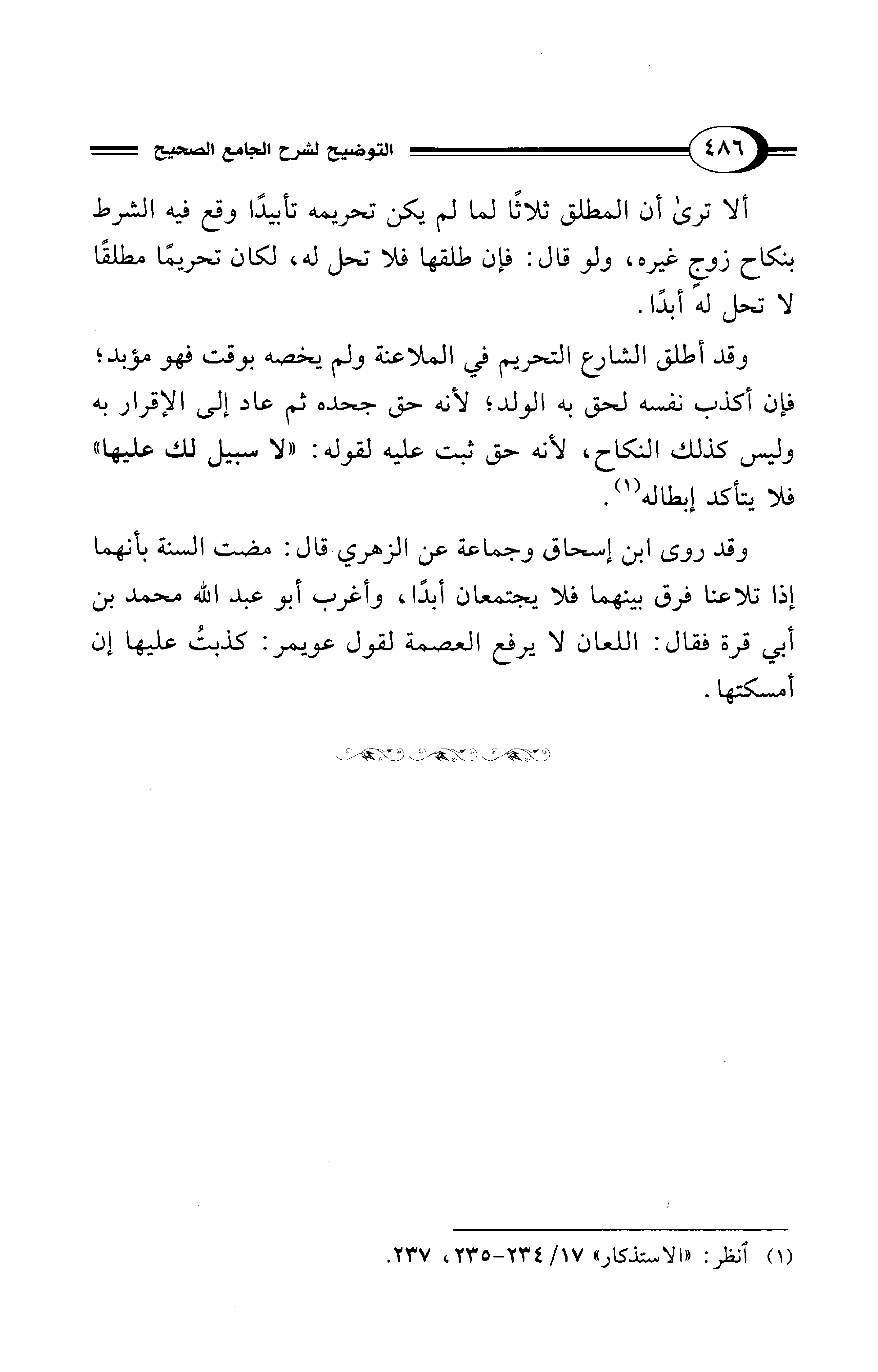 وقد روى ابن إسحاق وجماعة عن الزهري قال: مضت السنة بأنهما إذا تلاعنا فرق بينهما فلا يجتمعان أبدًا، وأغرب أبو عبد الله محمد بن أبي قرة فقال: اللعان لا يرفع العصمة لقول عويمر: كذبتُ عليها إن أمسكتها.