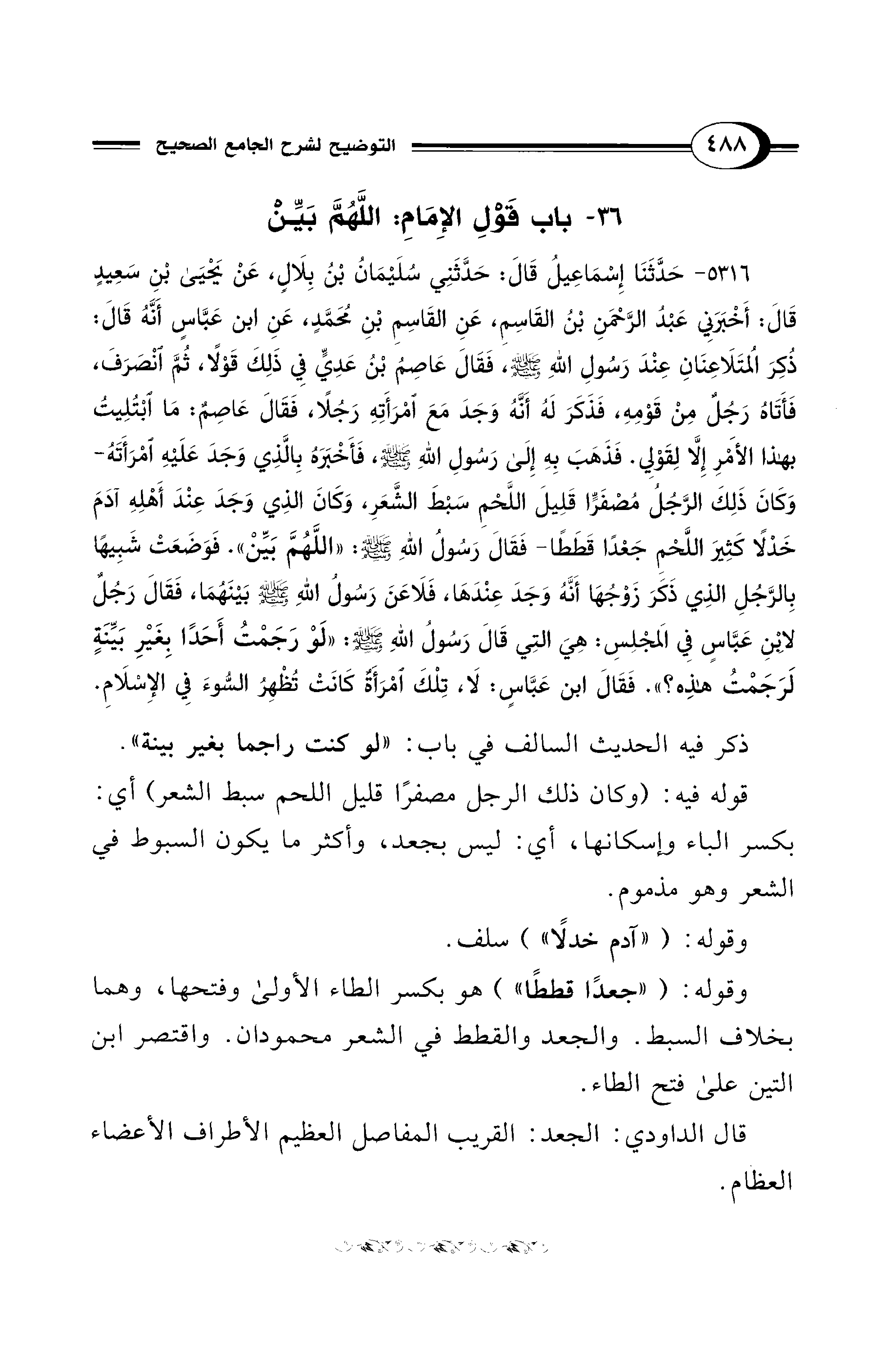 5316 - حَدَّثَنَا إِسْمَاعِيلُ قَالَ: حَدَّثَنِي سُلَيْمَانُ بْنُ بِلاَلٍ, عَنْ يَحْيَى بْنِ سَعِيدٍ قَالَ: أَخْبَرَنِي عَبْدُ الرَّحْمَنِ بْنُ الْقَاسِمِ, عَنِ الْقَاسِمِ بْنِ مُحَمَّدٍ, عَنِ ابْنِ عَبَّاسٍ أَنَّهُ قَالَ: ذُكِرَ الْمُتَلاَعِنَانِ عِنْدَ رَسُولِ اللهِ - صلى الله عليه وسلم -, فَقَالَ عَاصِمُ بْنُ عَدِيٍّ فِى ذَلِكَ قَوْلاً، ثُمَّ انْصَرَفَ, فَأَتَاهُ رَجُلٌ مِنْ قَوْمِهِ، فَذَكَرَ لَهُ أَنَّهُ وَجَدَ مَعَ امْرَأَتِهِ رَجُلاً، فَقَالَ عَاصِمٌ: مَا ابْتُلِيتُ بِهَذَا الأَمْرِ إِلاَّ لِقَوْلِي. فَذَهَبَ بِهِ إِلَى رَسُولِ اللهِ - صلى الله عليه وسلم -, فَأَخْبَرَهُ بِالَّذِي وَجَدَ عَلَيْهِ امْرَأَتَهُ -وَكَانَ ذَلِكَ الرَّجُلُ مُصْفَرًّا قَلِيلَ اللَّحْمِ سَبْطَ الشَّعَرِ، وَكَانَ الَّذِي وَجَدَ عِنْدَ أَهْلِهِ آدَمَ خَدْلاً كَثِيرَ اللَّحْمِ جَعْدًا قَطَطًا- فَقَالَ رَسُولُ اللهِ - صلى الله عليه وسلم -: «اللَّهُمَّ بَيِّنْ». فَوَضَعَتْ شَبِيهًا بِالرَّجُلِ الَّذِي ذَكَرَ زَوْجُهَا أَنَّهُ وَجَدَ عِنْدَهَا، فَلاَعَنَ رَسُولُ اللهِ - صلى الله عليه وسلم - بَيْنَهُمَا، فَقَالَ رَجُلٌ لاِبْنِ عَبَّاسٍ فِي الْمَجْلِسِ: هِيَ الَّتِي قَالَ رَسُولُ اللهِ - صلى الله عليه وسلم -: «لَوْ رَجَمْتُ أَحَدًا بِغَيْرِ بَيِّنَةٍ لَرَجَمْتُ هَذِهِ؟». فَقَالَ ابْنُ عَبَّاسٍ: لاَ, تِلْكَ امْرَأَةٌ كَانَتْ تُظْهِرُ السُّوءَ فِي الإِسْلاَمِ.
