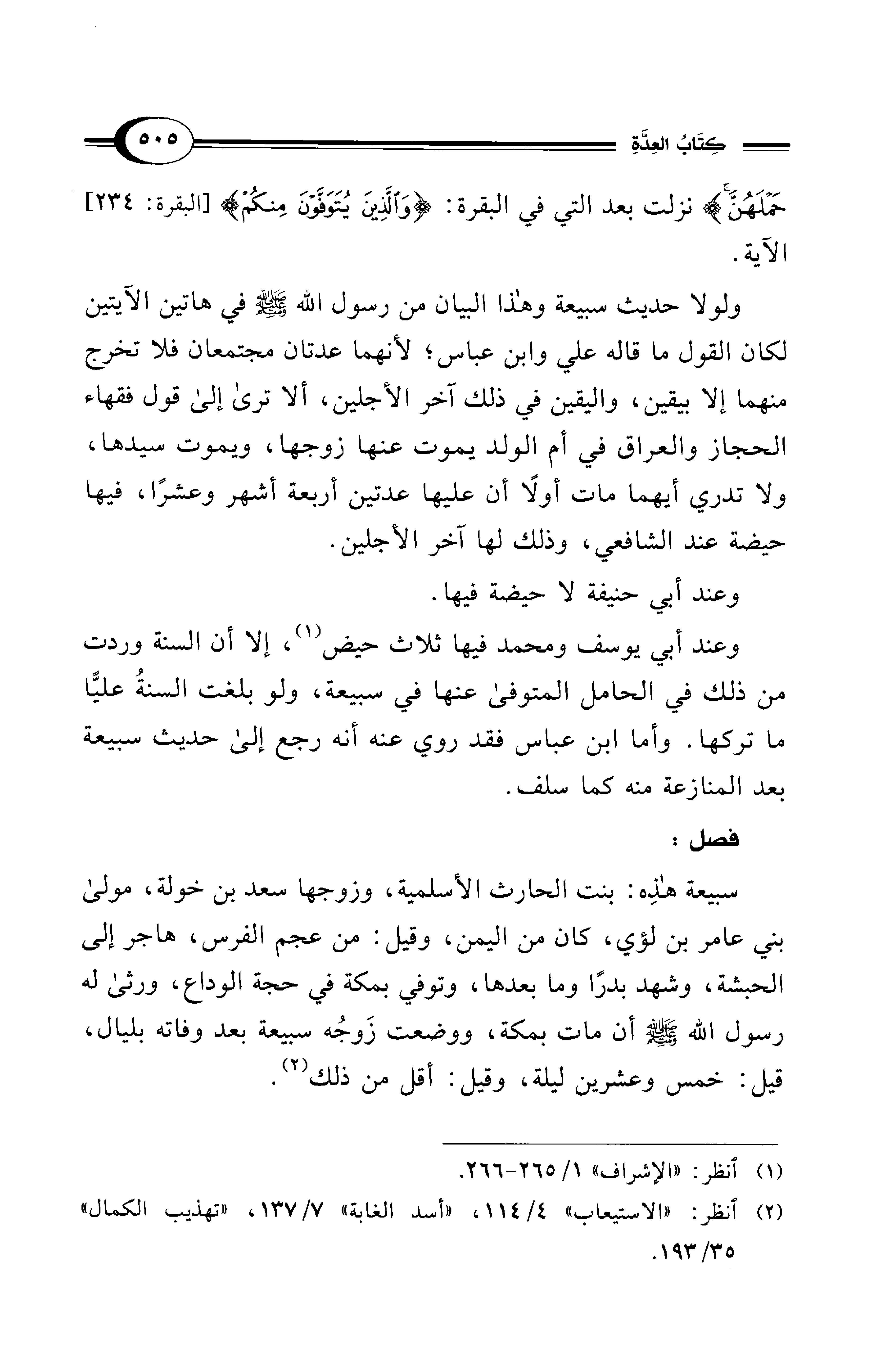 ولولا حديث سبيعة وهذا البيان من رسول الله - صلى الله عليه وسلم - في هاتين الآيتين لكان القول ما قاله علي وابن عباس؛ لأنهما عدتان مجتمعان فلا تخرج منهما إلا بيقين، واليقين في ذلك آخر الأجلين، ألا ترى إلى قول فقهاء الحجاز والعراق في أم الولد يموت عنها زوجها، ويموت سيدها، ولا تدري أيهما مات أولاً أن عليها عدتين أربعة أشهر وعشرًا، فيها حيضة عند الشافعي، وذلك لها آخر الأجلين.