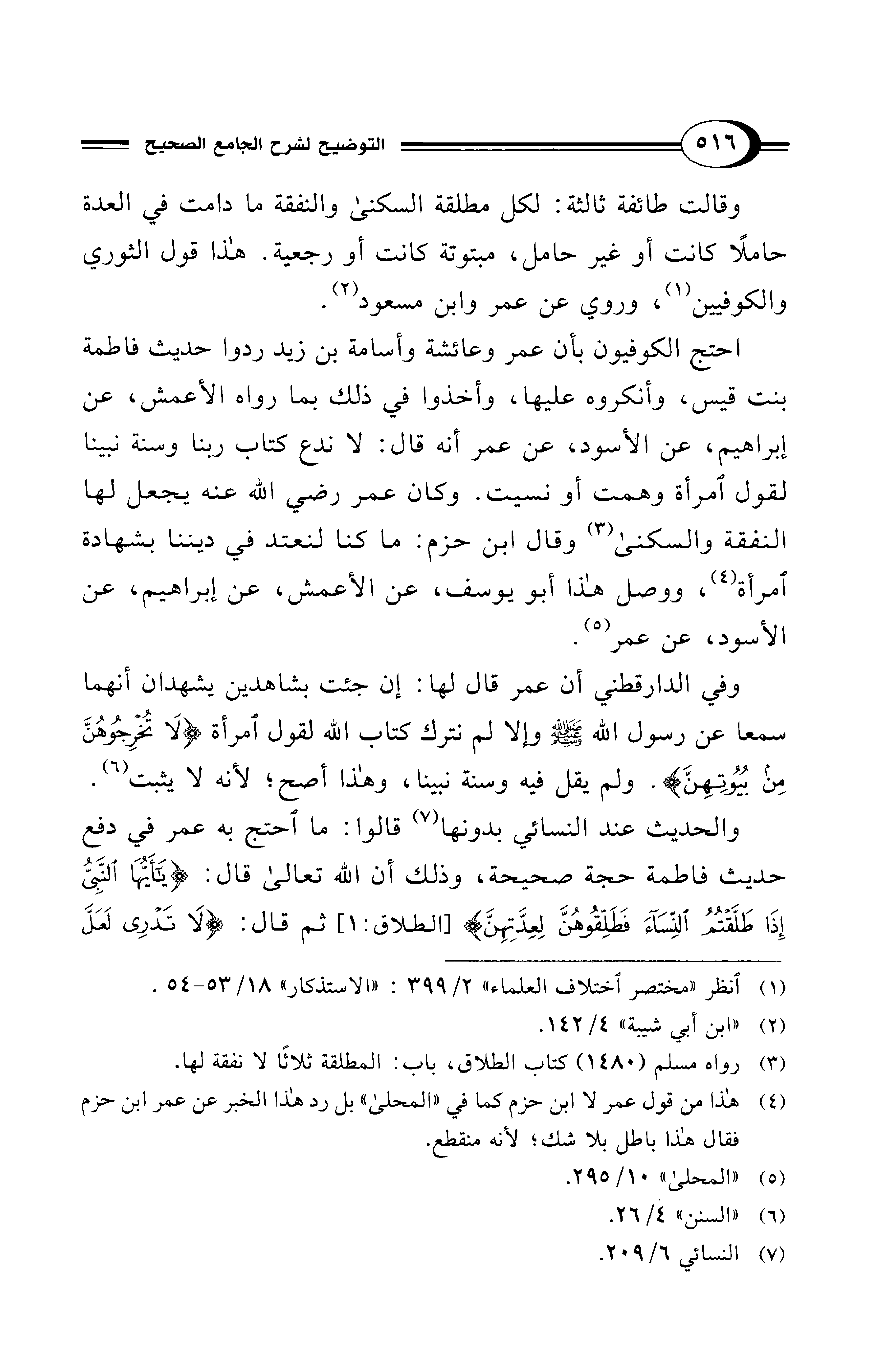 وفي الدارقطني أن عمر قال لها: إن جئت بشاهدين يشهدان أنهما سمعا عن رسول الله - صلى الله عليه وسلم - وإلا لم نترك كتاب الله لقول امرأة {لَا تُخرِجُوهُنَّ مِن بُيُوتِهِنّ}. ولم يقل فيه وسنة نبينا، وهذا أصح؛ لأنه لا يثبت (¬6).