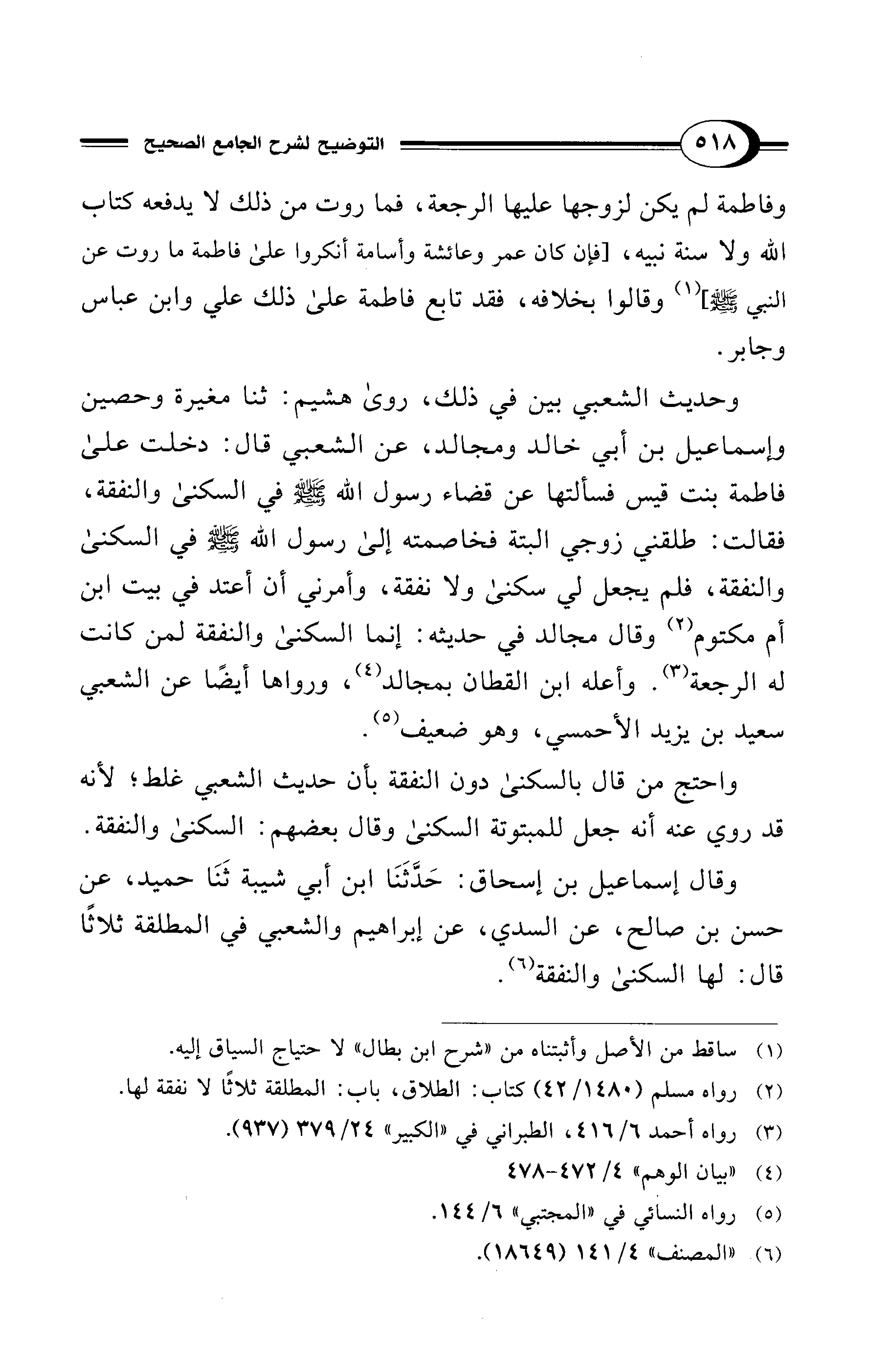 وحديث الشعبي بين في ذلك، روى هشيم: ثنا مغيرة وحصين وإسماعيل بن أبي خالد ومجالد، عن الشعبي قال: دخلت على فاطمة بنت قيس فسألتها عن قضاء رسول الله - صلى الله عليه وسلم - في السكنى والنفقة، فقالت: طلقني زوجي البتة فخاصمته إلى رسول الله - صلى الله عليه وسلم - في السكنى والنفقة، فلم يجعل لي سكنى ولا نفقة، وأمرني أن أعتد في بيت ابن أم مكتوم (¬2) وقال مجالد في حديثه: إنما السكنى والنفقة لمن كانت له الرجعة (¬3). وأعله ابن القطان بمجالد (¬4)، ورواها أيضًا عن الشعبي سعيد بن يزيد الأحمسي، وهو ضعيف (¬5).