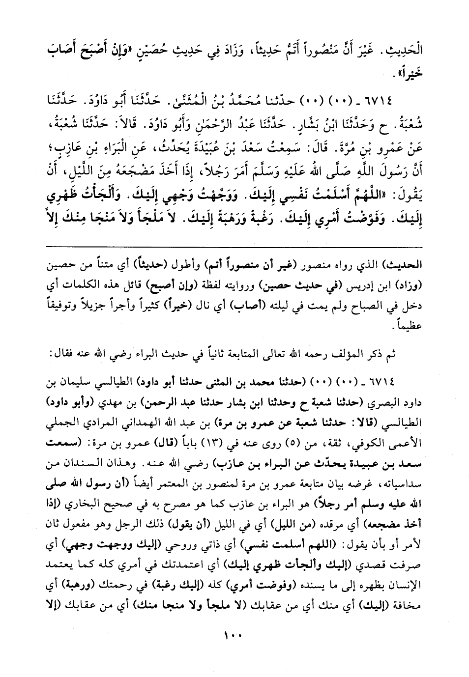 ٦٧١٤ - (٠٠) (٠٠) حدّثنا مُحَمَّدُ بْنُ الْمُثَنَّى. حَدَّثَنَا أَبُو دَاوُدَ. حَدَّثَنَا شُعْبَةُ. ح وَحَدَّثَنَا ابْنُ بَشَّارٍ. حَدَّثَنَا عَبْدُ الرَّحْمَنِ وَأَبُو دَاوُدَ. قَالَا: حَدَّثَنَا شُعْبَةُ، عَنْ عَمْرِو بْنِ مُرَّةَ. قَال: سَمِعْتُ سَعْدَ بْنَ عُبَيْدَةَ يُحَدِّثُ، عَنِ الْبَرَاءِ بْنِ عَازِبٍ؛ أَنَّ رَسُولَ اللهِ صَلَّى اللَّه عَلَيْهِ وَسَلَّمَ أَمَرَ رَجُلًا، إِذَا أَخَذَ مَضْجَعَهُ مِنَ اللَّيْلِ، أَنْ يَقُولَ: "اللَّهُمَّ أَسْلَمْتُ نَفسِي إِلَيْكَ. وَوَجَّهْتُ وَجْهِي إِلَيْكَ. وَأَلْجَأْتُ ظَهْرِي إِلَيكَ. وَفَوَّضْتُ أَمْرِي إِلَيكَ. رَغْبةً وَرَهْبَةً إِلَيْكَ. لَا مَلْجَأَ وَلَا مَنْجَا مِنْكَ إِلَّا