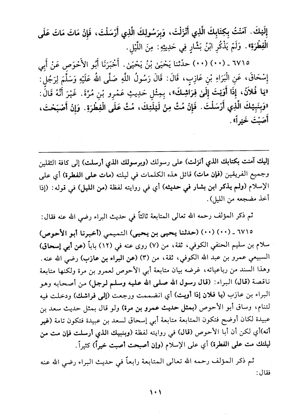 ٦٧١٥ - (٠٠) (٠٠) حدّثنا يَحْيَى بْنُ يَحْيَى. أَخْبَرَنَا أَبُو الأَحْوَص عَنْ أَبِي إِسْحَاقَ، عَنِ الْبَرَاءِ بْنِ عَازِبٍ، قَالَ: قَالَ رَسُولُ اللهِ صَلَّى اللَّه عَلَيْهِ وَسَلَّمَ لِرَجُلٍ: "يَا فُلَانُ، إِذَا أَوَيْتَ إِلَى فِرَاشِكَ"، بِمِثْلِ حَدِيثِ عَمْرِو بْنِ مُرَّةَ. غَيْرَ أَنَّهُ قَالَ: "وَبِنَبِيِّكَ الَّذِي أَرْسَلْتَ. فَإِنْ مُتَّ مِنْ لَيْلَتِكَ، مُتَّ عَلَى الْفِطْرَةِ. وَإِنْ أَصْبَحْتَ، أَصَبْتَ خَيرًا"