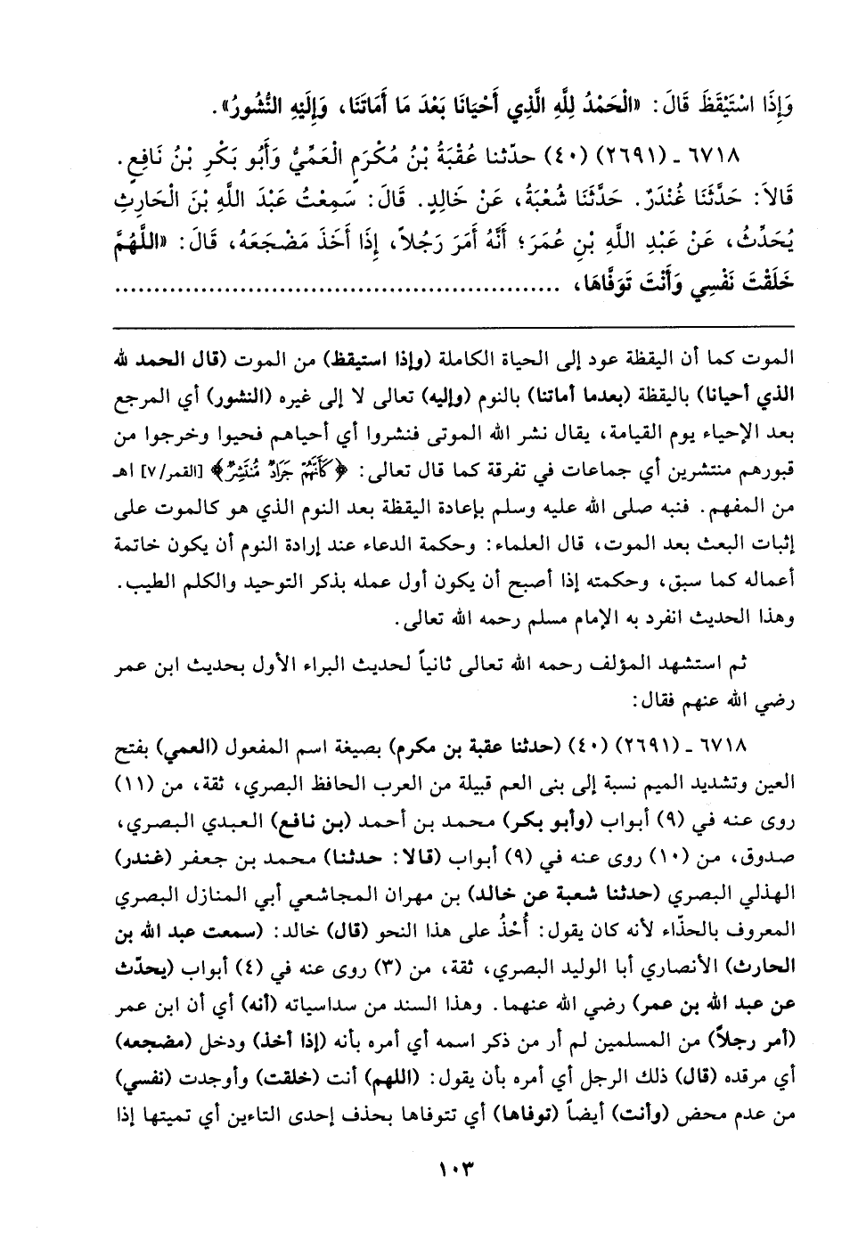 ٦٧١٨ - (٢٦٩١) (٤٠) حدّثنا عُقْبَةُ بْنُ مُكْرَمِ الْعَمِّيُّ وَأَبُو بَكْرِ بْنُ نَافِعٍ. قَالَا: حَدَّثَنَا غُنْدَرٌ. حَدَّثَنَا شُعْبَةُ، عَنْ خَالِدٍ. قَالَ: سَمِعْتُ عَبْدَ اللهِ بْنَ الْحَارِثِ يُحَدِّثُ، عَنْ عَبْدِ اللَّهِ بْنِ عُمَرَ؛ أَنَّهُ أَمَرَ رَجُلًا، إِذَا أَخَذَ مَضْجَعَهُ، قَالَ: "اللَّهُمَّ خَلَقْتَ نَفْسِي وَأَنْتَ تَوَفَّاهَا،