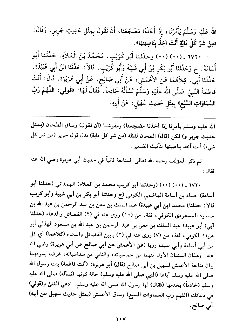 ٦٧٢٠ - (٠٠) (٠٠) (وحدثنا أبو كريب محمد بن العلاء) الهمداني (حدثنا أبو أسامة) حماد بن أسامة الهاشمي الكوفي (ح وحدثنا أبو بكر بن أبي شيبة وأبو كريب قالا: حدثنا) محمد (بن أبي عبيدة) عبد الملك بن معن بن عبد الرحمن بن عبد الله بن مسعود المسعودي الكوفي، ثقة، من (١٠) روى عنه في (٢) الفضائل والدعاء (حدثنا أبي) أبو عبيدة عبد الملك بن معن بن عبد الرحمن بن عبد الله بن مسعود الهذلي أبو عبيدة الكوفي، ثقة، من (٧) روى عنه في (٢) بابين الفضائل والدعاء (كلاهما) أي كل من أبي أسامة وأبي عبيدة رويا (عن الأعمش عن أبي صالح عن أبي هريرة) رضي الله عنه. وهذان السندان الأول منهما من خماسياته، والثاني من سداسياته، غرضه بسوقهما بيان متابعة الأعمش لسهيل بن أبي صالح (قال) أبو هريرة: (أتت فاطمة) بنت رسول الله صلى الله عليه وسلم أباها (النبي صلى الله عليه وسلم) حالة كونها (تسأله) صلى الله عليه وسلم (خادمًا) يخدمها (فقال) لها رسول الله صلى الله عليه وسلم: ادعي الغنى و (قولي) في دعائك (اللهم رب السماوات السبع) وساق الأعمش (بمثل حديث سهيل عن أبيه) أبي صالح.