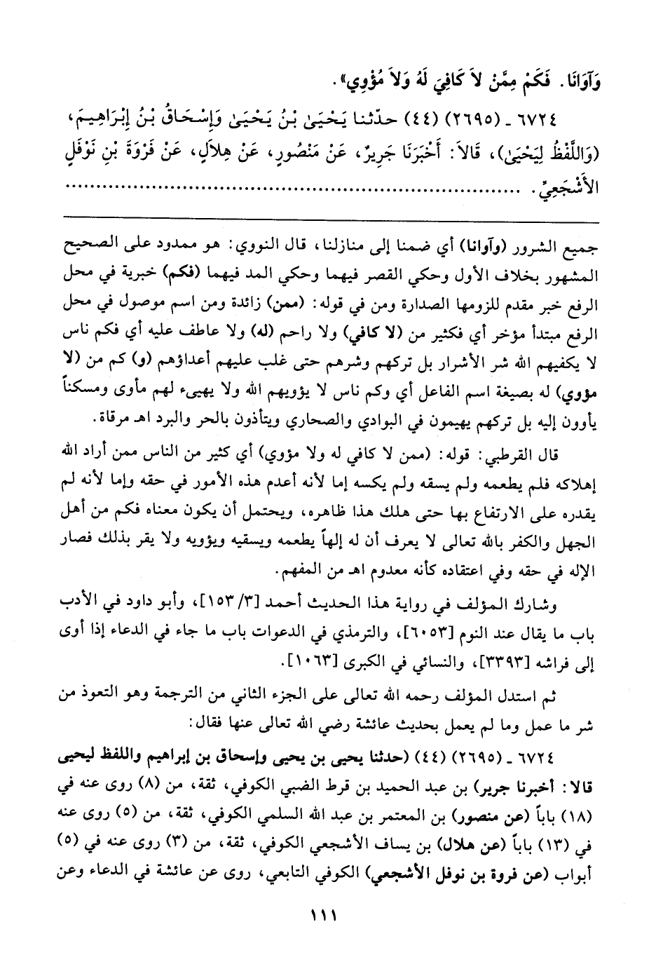 ٦٧٢٤ - (٢٦٩٥) (٤٤) (حدثنا يحيى بن يحيى وإسحاق بن إبراهيم واللفظ ليحيى قالا: أخبرنا جرير) بن عبد الحميد بن قرط الضبي الكوفي، ثقة، من (٨) روى عنه في (١٨) بابًا (عن منصور) بن المعتمر بن عبد الله السلمي الكوفي، ثقة، من (٥) روى عنه في (١٣) بابًا (عن هلال) بن يساف الأشجعي الكوفي، ثقة، من (٣) روى عنه في (٥) أبواب (عن فروة بن نوفل الأشجعي) الكوفي التابعي، روى عن عائشة في الدعاء وعن