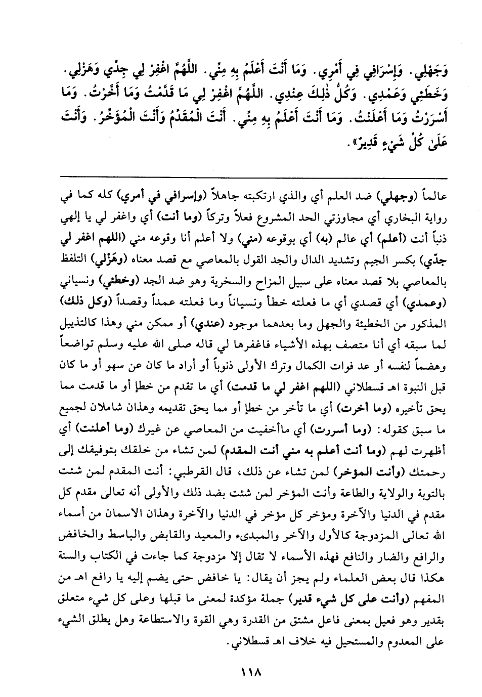 وَجَهْلِي. وَإسْرَافِي فِي أَمْرِي. وَمَا أَنْتَ أَعْلَمُ بِهِ مِنِّي. اللَّهُمَّ اغْفِرْ لِي جِدِّي وَهَزْلِي. وَخَطَئِي وَعَمْدِي. وَكُلُّ ذلِكَ عِنْدِي. اللَّهُمَّ اغْفِرْ لِي مَا قَدَّمْتُ وَمَا أَخَّرْتُ. وَمَا أَسْرَرْتُ وَمَا أَعْلَنْتُ. وَمَا أَنْتَ أَعْلَمُ بِهِ مِنِّي. أَنْتَ الْمُقَدِّمُ وَأَنْتَ الْمُؤَخِّرُ. وَأَنْتَ عَلَى كُلِّ شَيءٍ قَدِيرٌ"