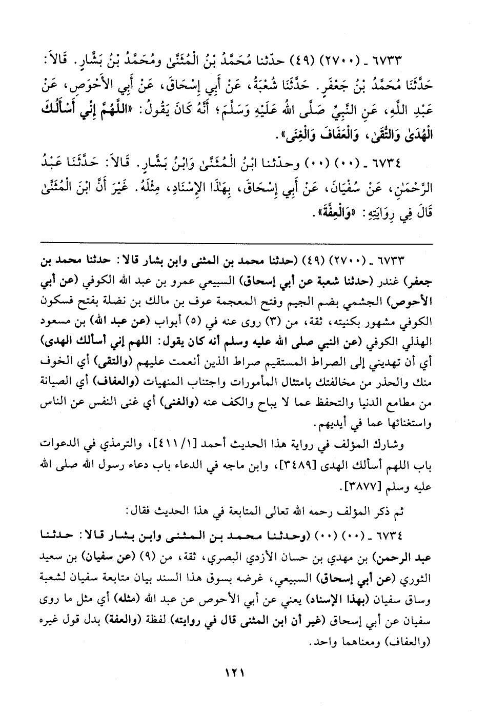 ٦٧٣٣ - (٢٧٠٠) (٤٩) حدّثنا مُحَمَّدُ بْنُ الْمُثَنَّى ومُحَمَّدُ بْنُ بَشارٍ. قَالَا: حَدَّثَنَا مُحَمَّدُ بْنُ جَعْفَرٍ. حَدَّثَنَا شُعْبَةُ، عَنْ أَبِي إِسْحَاقَ، عَنْ أَبِي الأَحْوَصِ، عَنْ عَبْدِ اللهِ، عَنِ النَّبِى صَلَّى اللهُ عَلَيْهِ وَسَلَّمَ؛ أَنَّهُ كَانَ يَقُولُ: "اللَّهُمَّ إِنِّي أَسْأَلُكَ الْهُدَى وَالتُّقَى، وَالْعَفَافَ وَالْغِنَى".