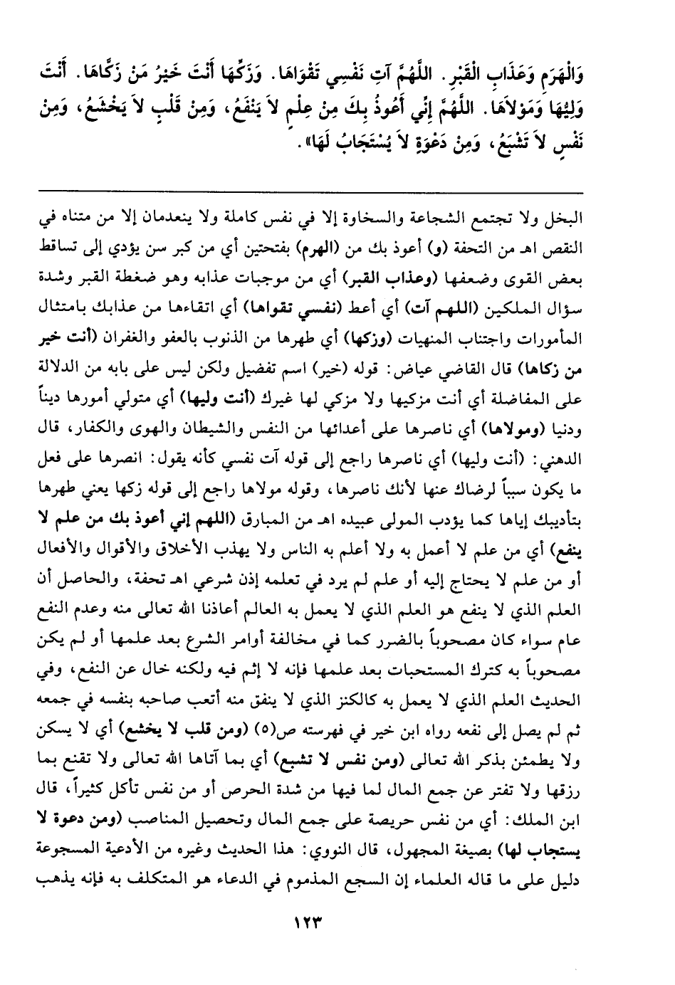 وَالْهَرَمِ وَعَذَابِ الْقَبْرِ. اللَّهُمَّ آتِ نَفْسِي تَقْوَاهَا. وَزَكِّهَا أَنْتَ خَيرُ مَنْ زَكَّاهَا. أَنْتَ وَلِيهَا وَمَوْلَاهَا. اللَّهُمَّ إِنِّي أَعُوذُ بِكَ مِنْ عِلْمٍ لَا يَنْفَعُ، وَمِنْ قَلْبٍ لَا يَخْشَعُ، وَمِنْ نَفْسٍ لَا تَشْبَعُ، وَمِنْ دَعْوَةٍ لَا يُسْتَجَابُ لَهَا"