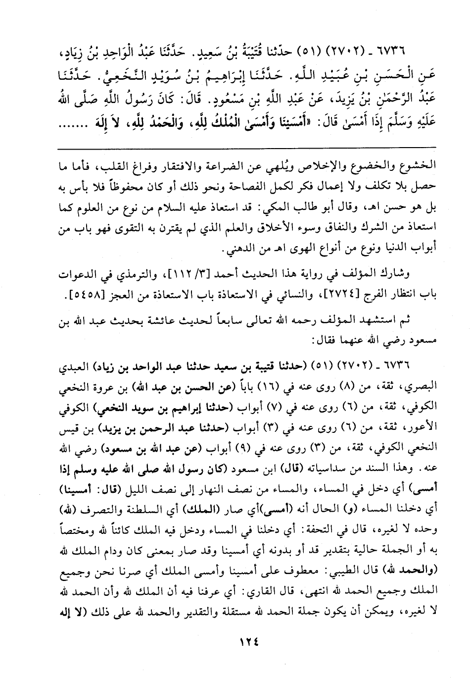 ٦٧٣٦ - (٢٧٠٢) (٥١) (حدثنا قتيبة بن سعيد حدثنا عبد الواحد بن زياد) العبدي البصري، ثقة، من (٨) روى عنه في (١٦) بابًا (عن الحسن بن عبد الله) بن عروة النخعي الكوفي، ثقة، من (٦) روى عنه في (٧) أبواب (حدثنا إبراهيم بن سويد النخعي) الكوفي الأعور، ثقة، من (٦) روى عنه في (٣) أبواب (حدثنا عبد الرحمن بن يزيد) بن قيس النخعي الكوفي، ثقة، من (٣) روى عنه في (٩) أبواب (عن عبد الله بن مسعود) رضي الله عنه. وهذا السند من سداسياته (قال) ابن مسعود (كان رسول الله صلى الله عليه وسلم إذا أمسى) أي دخل في المساء، والمساء من نصف النهار إلى نصف الليل (قال: أمسينا) أي دخلنا المساء (و) الحال أنه (أمسى) أي صار (الملك) أي السلطنة والتصرف (لله) وحده لا لغيره، قال في التحفة: أي دخلنا في المساء ودخل فيه الملك كائنًا لله ومختصًا به أو الجملة حالية بتقدير قد أو بدونه أي أمسينا وقد صار بمعنى كان ودام الملك لله (والحمد لله) قال الطيبي: معطوف على أمسينا وأمسى الملك أي صرنا نحن وجميع الملك وجميع الحمد لله انتهى، قال القاري: أي عرفنا فيه أن الملك لله وأن الحمد لله لا لغيره، ويمكن أن يكون جملة الحمد لله مستقلة والتقدير والحمد لله على ذلك إلا إله