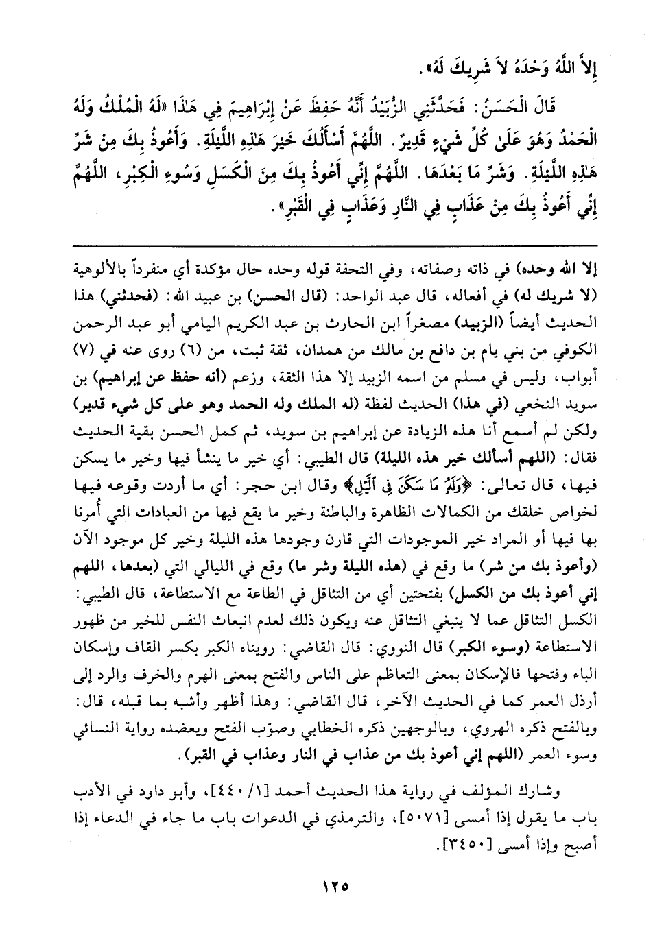قَالَ الْحَسَنُ: فَحَدَّثَنِي الزُّبَيْدُ أَنَّهُ حَفِظَ عَنْ إِبْرَاهِيمَ فِي هَذَا "لَهُ الْمُلْكُ وَلَهُ الْحَمْدُ وَهُوَ عَلَى كُل شَيءٍ قَدِيرٍ. اللَّهُمَّ أَساَلُكَ خَيْرَ هَذِهِ اللَّيْلَةِ. وَأَعُوذُ بِكَ مِنْ شَرِّ هَذِهِ اللَّيْلَةِ. وَشَرِّ مَا بَعْدَهَا. اللَّهُمَّ إِنِّي أَعُوذُ بِكَ مِنَ الْكَسَلِ وَسُوءِ الْكِبْرِ، اللَّهُمَّ إِنِّي أَعُوذُ بِكَ مِنْ عَذَابٍ فِي النَّارِ وَعَذَابٍ فِي الْقَبْرِ"