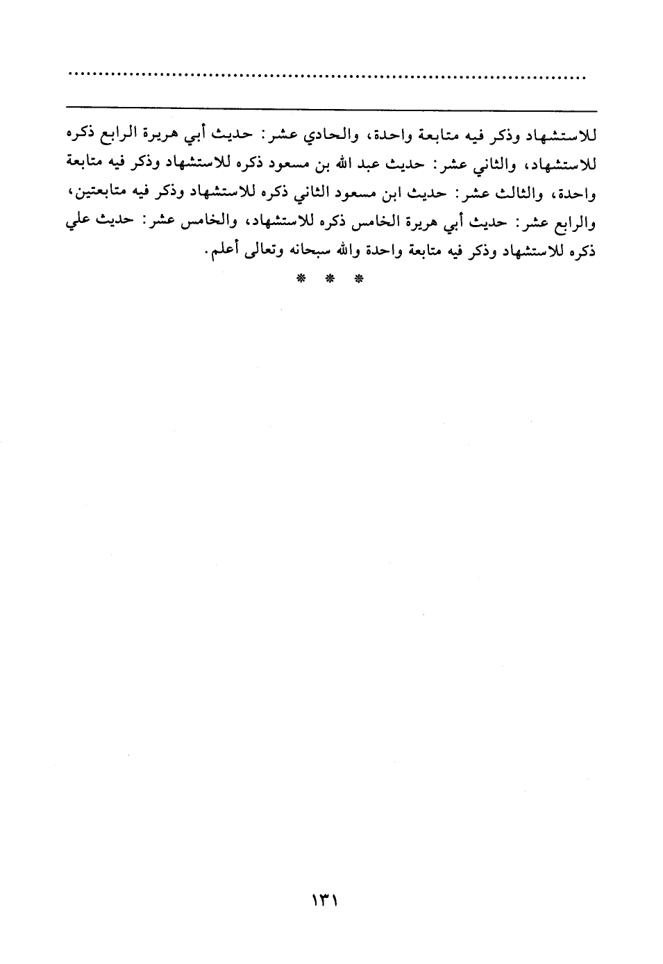 للاستشهاد وذكر فيه متابعة واحدة، والحادي عشر: حديث أبي هريرة الرابع ذكره للاستشهاد، والثاني عشر: حديث عبد الله بن مسعود ذكره للاستشهاد وذكر فيه متابعة واحدة، والثالث عشر: حديث ابن مسعود الثاني ذكره للاستشهاد وذكر فيه متابعتين، والرابع عشر: حديث أبي هريرة الخاص ذكره للاستشهاد، والخامس عشر: حديث علي ذكره للاستشهاد وذكر فيه متابعة واحدة والله سبحانه وتعالى أعلم.