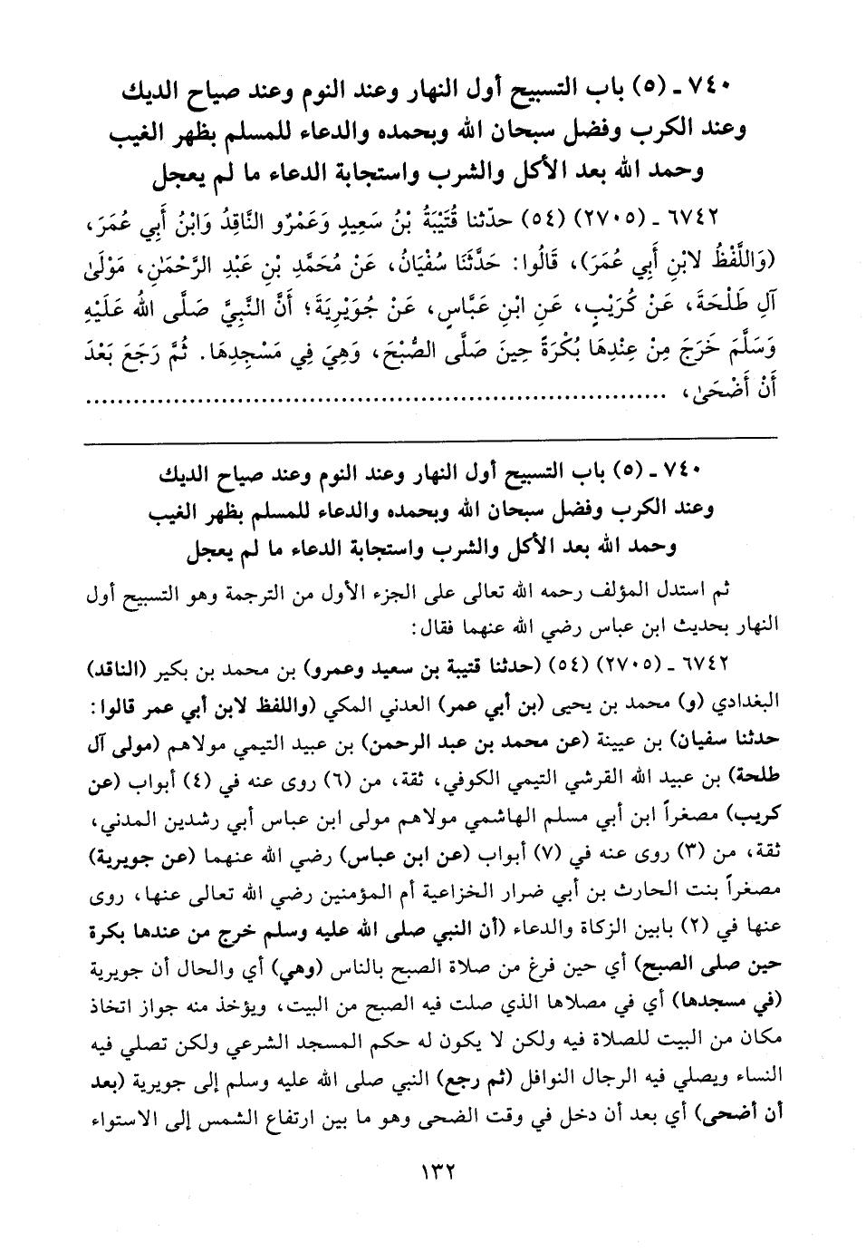 ٦٧٤٢ - (٢٧٠٥) (٥٤) حدّثنا قُتَيْبَةُ بْنُ سَعِيدٍ وَعَمْرٌو النَّاقِدُ وَابْنُ أَبِي عُمَرَ، (وَاللَّفْظُ لابْنِ أَبِي عُمَرَ)، قَالُوا: حَدَّثَنَا سُفْيَانُ، عَنْ مُحَمَّدِ بْنِ عَبْدِ الرَّحْمَنِ، مَوْلَى آلِ طَلْحَةَ، عَنْ كُرَيْبٍ، عَنِ ابْنِ عَبَّاسِ، عَنْ جُوَيْرِيَةَ؛ أَنَّ النَّبِيَّ صلّى اللهُ عَلَيْهِ وَسَلَّمَ خَرَجَ مِنْ عِنْدِهَا بُكْرَة حِينَ صَلَّى الصُّبْحَ، وَهِيَ فِي مَسْجِدِهَا. ثُمَّ رَجَعَ بَعْدَ أَنْ أَضحَى،