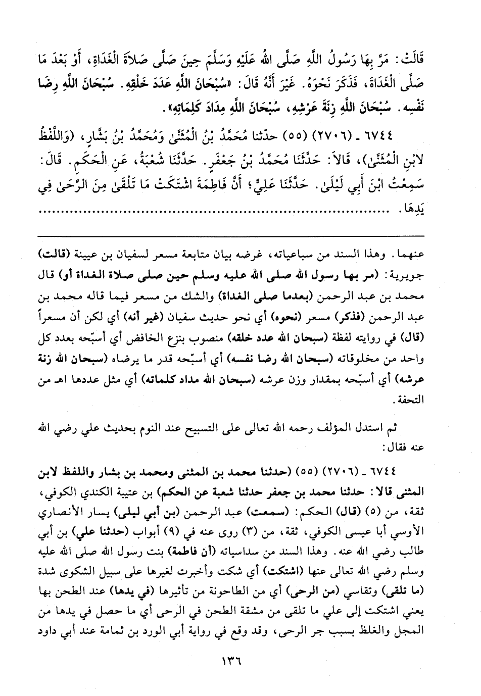 ٦٧٤٤ - (٢٧٠٦) (٥٥) (حدثنا محمد بن المثنى ومحمد بن بشار واللفظ لابن المثنى قالا: حدثنا محمد بن جعفر حدثنا شعبة عن الحكم) بن عتيبة الكندي الكوفي، ثقة، من (٥) (قال) الحكم: (سمعت) عبد الرحمن (بن أبي ليلى) يسار الأنصاري الأوسي أبا عيسى الكوفي، ثقة، من (٣) روى عنه في (٩) أبواب (حدثنا علي) بن أبي طالب رضي الله عنه. وهذا السند من سداسياته (أن فاطمة) بنت رسول الله صلى الله عليه وسلم رضي الله تعالى عنها (اشتكت) أي شكت وأخبرت لغيرها على سبيل الشكوى شدة (ما تلقى) وتقاسي (من الرحى) أي من الطاحونة من تأثيرها (في يدها) عند الطحن بها يعني اشتكت إلى علي ما تلقى من مشقة الطحن في الرحى أي ما حصل في يدها من المجل والغلظ بسبب جر الرحى، وقد وقع في رواية أبي الورد بن ثمامة عند أبي داود