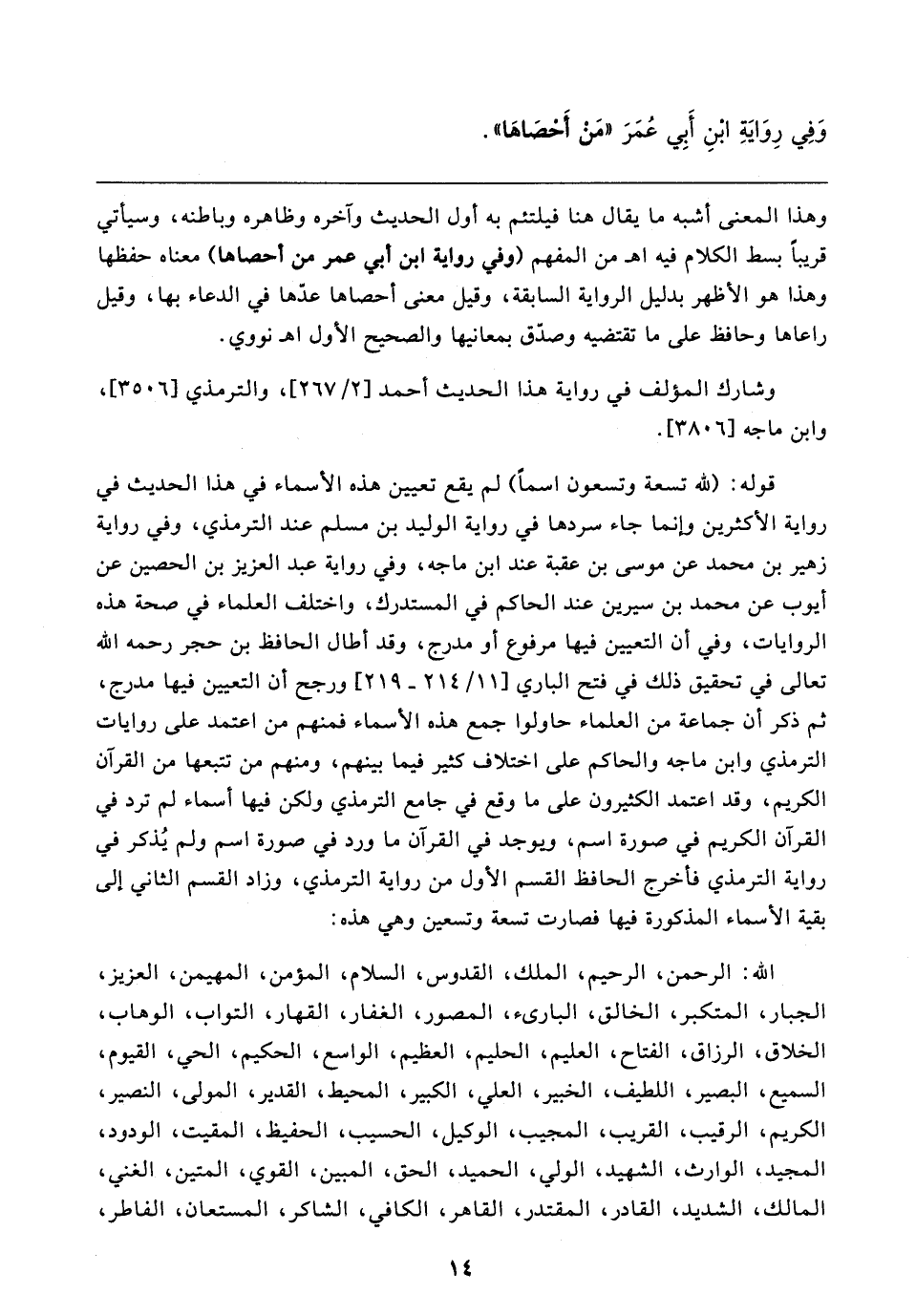 قوله: (لله تسعة وتسعون اسمًا) لم يقع تعيين هذه الأسماء في هذا الحديث في رواية الأكثرين وإنما جاء سردها في رواية الوليد بن مسلم عند الترمذي، وفي رواية زهير بن محمد عن موسى بن عقبة عند ابن ماجه، وفي رواية عبد العزيز بن الحصين عن أيوب عن محمد بن سيرين عند الحاكم في المستدرك، واختلف العلماء في صحة هذه الروايات، وفي أن التعيين فيها مرفوع أو مدرج، وقد أطال الحافظ بن حجر رحمه الله تعالى في تحقيق ذلك في فتح الباري [١١/ ٢١٤ - ٢١٩] ورجح أن التعيين فيها مدرج، ثم ذكر أن جماعة من العلماء حاولوا جمع هذه الأسماء فمنهم من اعتمد على روايات الترمذي وابن ماجة والحاكم على اختلاف كثير فيما بينهم، ومنهم من تتبعها من القرآن الكريم، وقد اعتمد الكثيرون على ما وقع في جامع الترمذي ولكن فيها أسماء لم ترد في القرآن الكريم في صورة اسم، ويوجد في القرآن ما ورد في صورة اسم ولم يُذكر في رواية الترمذي فأخرج الحافظ القسم الأول من رواية الترمذي، وزاد القسم الثاني إلى بقية الأسماء المذكورة فيها فصارت تسعة وتسعين وهي هذه: