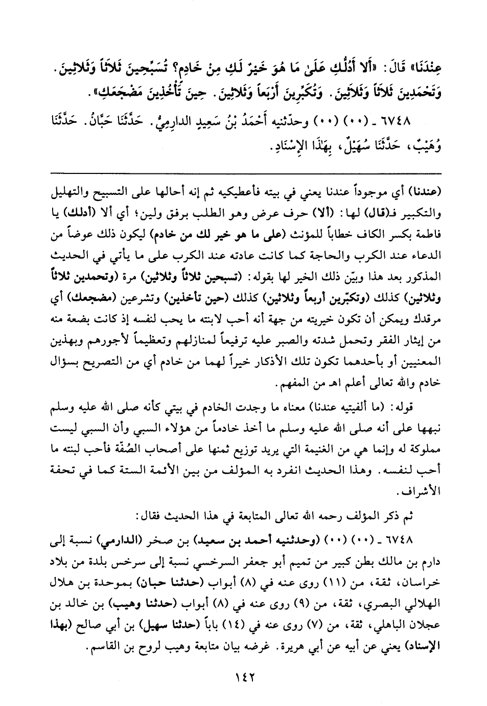 عِنْدَنَا" قَالَ: "أَلا أَدُلُّكِ عَلَى مَا هُوَ خَيرٌ لَكِ مِنْ خَادِمٍ؟ تُسَبِّحِينَ ثَلَاثًا وَثَلاِثِينَ. وَتَحْمَدِينَ ثَلَاثًا وَثَلَاثِينَ. وَتُكَبِّرِينَ أَرْبَعًا وَثَلاِثينَ. حِينَ تأخُذِينَ مَضْجَعَكِ".