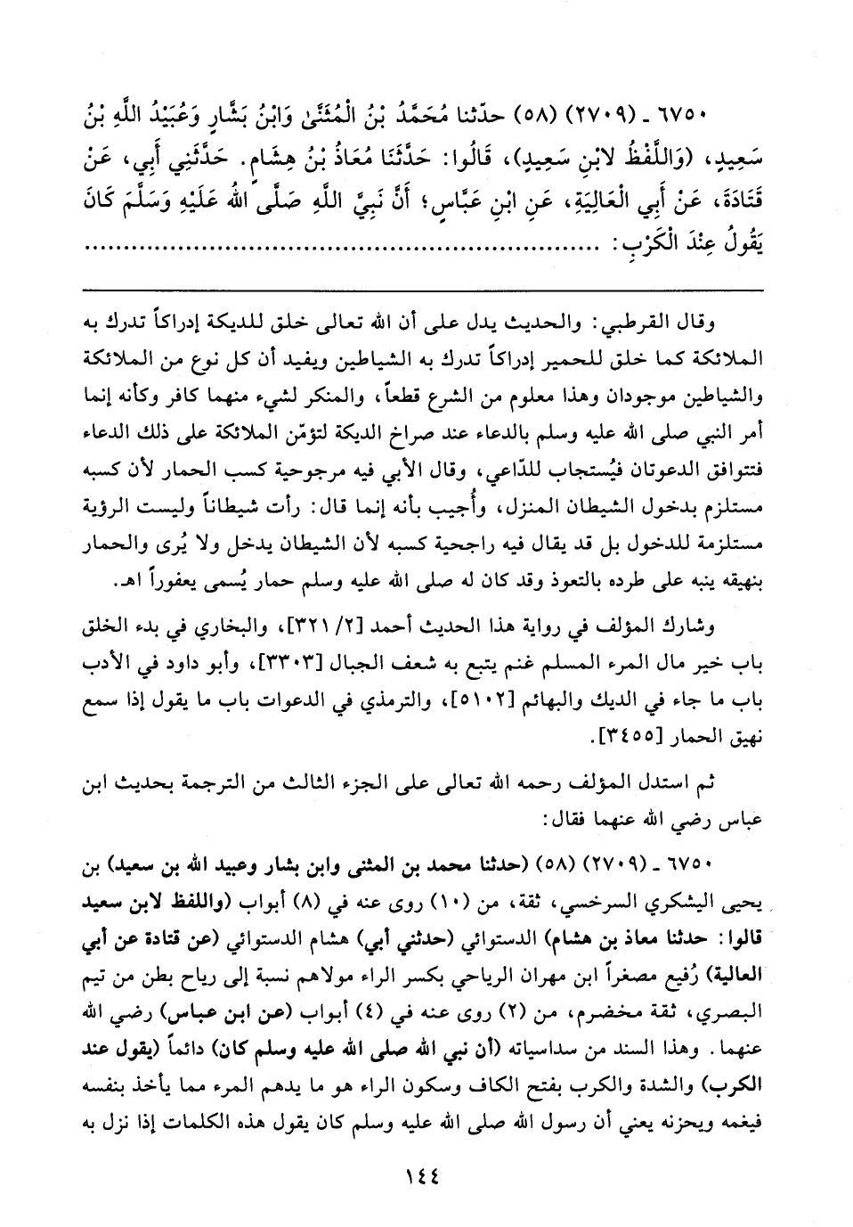 ٦٧٥٠ - (٢٧٠٩) (٥٨) (حدثنا محمد بن المثنى وابن بشار وعبيد الله بن سعيد) بن يحيى اليشكري السرخسي، ثقة، من (١٥) روى عنه في (٨) أبواب (واللفظ لابن سعيد قالوا: حدثنا معاذ بن هشام) الدستوائي (حدثني أبي) هشام الدستوائي (عن قتادة عن أبي العالية) رُفيع مصغرًا بن مهران الرياحي بكسر الراء مولاهم نسبة إلى رياح بطن من تيم البصري، ثقة مخضرم، من (٢) روى عنه في (٤) أبواب (عن ابن عباس) رضي الله عنهما. وهذا السند من سداسياته (أن نبي الله صلى الله عليه وسلم كان) دائمًا (يقول عند الكرب) والشدة والكرب بفتح الكاف وسكون الراء هو ما يدهم المرء مما يأخذ بنفسه فيغمه ويحزنه يعني أن رسول الله صلى الله عليه وسلم كان يقول هذه الكلمات إذا نزل به