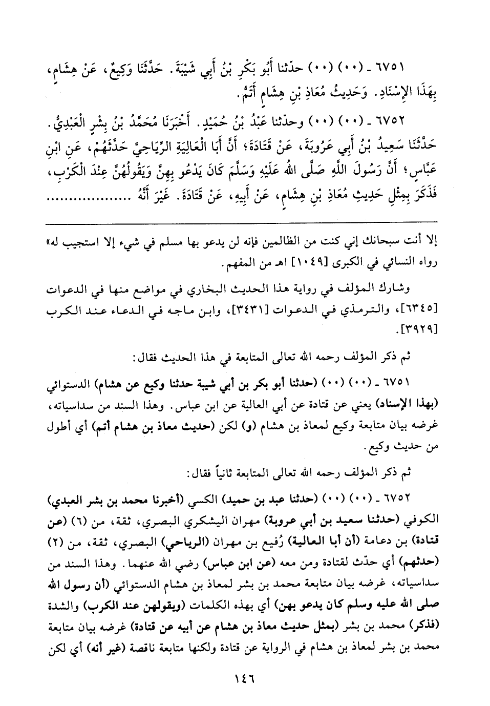 ٦٧٥٢ - (٠٠) (٠٠) (حدثنا عبد بن حميد) الكسي (أخبرنا محمد بن بشر العبدي) الكوفي (حدثنا سعيد بن أبي عروبة) مهران اليشكري البصري، ثقة، من (٦) (عن قتادة) بن دعامة (أن أبا العالية) رُفيع بن مهران (الرياحي) البصري، ثقة، من (٢) (حدثهم) أي حدّث لقتادة ومن معه (عن ابن عباس) رضي الله عنهما. وهذا السند من سداسياته، غرضه بيان متابعة محمد بن بشر لمعاذ بن هشام الدستوائي (أن رسول الله صلى الله عليه وسلم كان يدعو بهن) أي بهذه الكلمات (ويقولهن عند الكرب) والشدة (فذكر) محمد بن بشر (بمثل حديث معاذ بن هشام عن أبيه عن قتادة) غرضه بيان متابعة محمد بن بشر لمعاذ بن هشام في الرواية عن قتادة ولكنها متابعة ناقصة (غير أنه) أي لكن