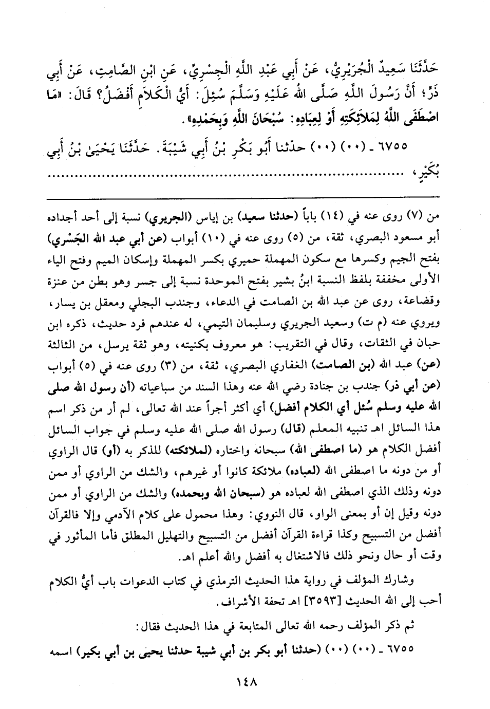 من (٧) روى عنه في (١٤) بابًا (حدثنا سعيد) بن إياس (الجريري) نسبة إلى أحد أجداده أبو مسعود البصري، ثقة، من (٥) روى عنه في (١٠) أبواب (عن أبي عبد الله الجَسْري) بفتح الجيم وكسرها مع سكون المهملة حميري بكسر المهملة وإسكان الميم وفتح الياء الأولى مخففة بلفظ النسبة ابنُ بشير بفتح الموحدة نسبة إلى جسر وهو بطن من عنزة وقضاعة، روى عن عبد الله بن الصامت في الدعاء، وجندب البجلي ومعقل بن يسار، ويروي عنه (م ت) وسعيد الجريري وسليمان التيمي، له عندهم فرد حديث، ذكره ابن حبان في الثقات، وقال في التقريب: هو معروف بكنيته، وهو ثقة يرسل، من الثالثة (عن) عبد الله (بن الصامت) الغفاري البصري، ثقة، من (٣) روى عنه في (٥) أبواب (عن أبي ذر) جندب بن جنادة رضي الله عنه وهذا السند من سباعياته (أن رسول الله صلى الله عليه وسلم سُئل أي الكلام أفضل) أي أكثر أجرًا عند الله تعالى، لم أر من ذكر اسم هذا السائل اه تنبيه المعلم (قال) رسول الله صلى الله عليه وسلم في جواب السائل أفضل الكلام هو (ما اصطفى الله) سبحانه واختاره (لملائكته) للذكر به (أو) قال الراوي أو من دونه ما اصطفى الله (عباده) ملائكة كانوا أو غيرهم، والشك من الراوي أو ممن دونه وذلك الذي اصطفى الله لعباده هو (سبحان الله وبحمده) والشك من الراوي أو ممن دونه وقيل إن أو بمعنى الواو، قال النووي: وهذا محمول على كلام الآدمي وإلا فالقرآن اْفضل من التسبيح وكذا قراءة القرآن أفضل من التسبيح والتهليل المطلق فأما المأثور في وقت أو حال ونحو ذلك فالاشتغال به أفضل والله أعلم اه.