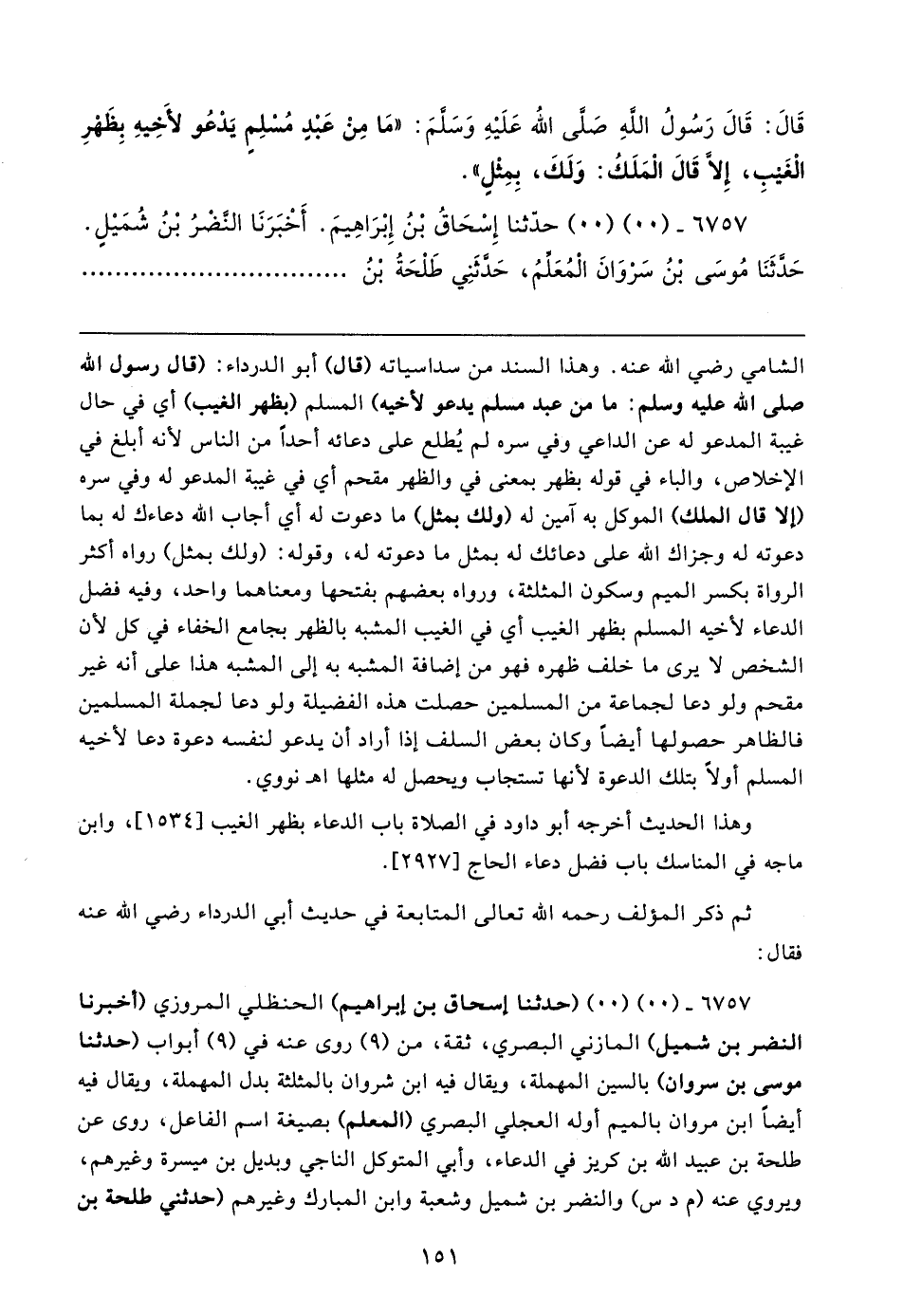 الشامي رضي الله عنه. وهذا السند من سداسياته (قال) أبو الدرداء: (قال رسول الله صلى الله عليه وسلم: ما من عبد مسلم يدعو لأخيه) المسلم (بظهر الغيب) أي في حال غيبة المدعو له عن الداعي وفي سره لم يُطلع على دعائه أحدًا من الناس لأنه أبلغ في الإخلاص، والباء في قوله بظهر بمعنى في والظهر مقحم أي في غيبة المدعو له وفي سره (إلا قال الملك) الموكل به آمين له (ولك بمثل) ما دعوت له أي أجاب الله دعاءك له بما دعوته له وجزاك الله على دعائك له بمثل ما دعوته له، وقوله: (ولك بمثل) رواه أكثر الرواة بكسر الميم وسكون المثلثة، ورواه بعضهم بفتحها ومعناهما واحد، وفيه فضل الدعاء لأخيه المسلم بظهر الغيب أي في الغيب المشبه بالظهر بجامع الخفاء في كل لأن الشخص لا يرى ما خلف ظهره فهو من إضافة المشبه به إلى المشبه هذا على أنه غير مقحم ولو دعا لجماعة من المسلمين حصلت هذه الفضيلة ولو دعا لجملة المسلمين فالظاهر حصولها أيضًا وكان بعض السلف إذا أراد أن يدعو لنفسه دعوة دعا لأخيه المسلم أولًا بتلك الدعوة لأنها تستجاب ويحصل له مثلها اه نووي.