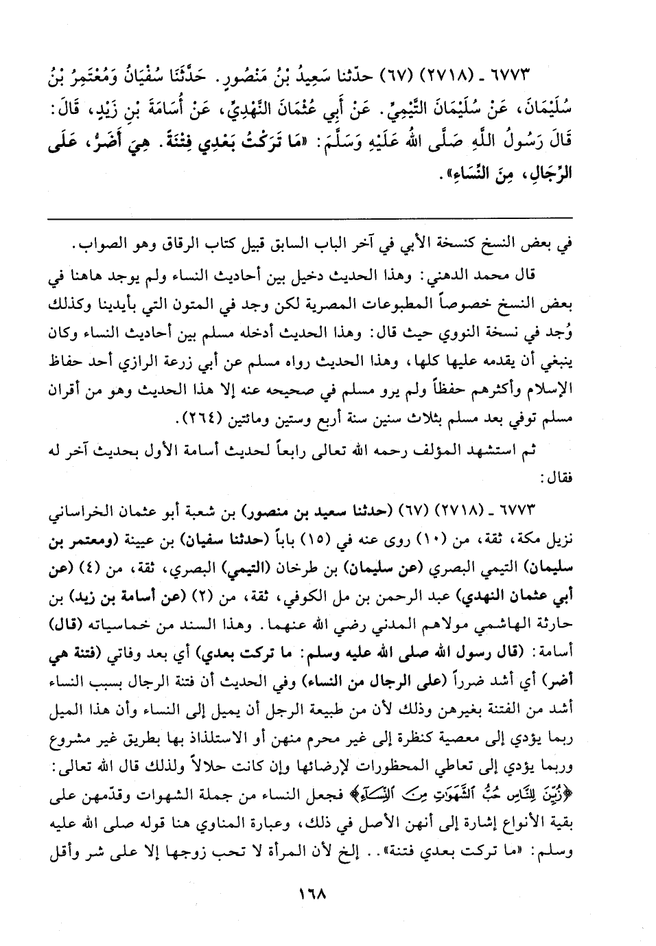 ٦٧٧٣ - (٢٧١٨) (٦٧) حدّثنا سَعِيدُ بْنُ مَنْصُورٍ. حَدَّثَنَا سُفْيَانُ وَمُعْتَمِرُ بْنُ سُلَيْمَانَ، عَنْ سُلَيْمَانَ التَّيمِيِّ. عَنْ أَبِي عُثْمَانَ النَّهْدِيِّ، عَنْ أُسَامَةَ بْنِ زيدٍ، قَالَ: قَالَ رَسُولُ اللهِ صَلَّى الله عَلَيْهِ وَسلَّمَ: "مَا تَرَكتُ بَعْدِي فِتنَةً. هِيَ أَضَرُّ، عَلَى الرِّجالِ، مِنَ النِّسَاءِ"