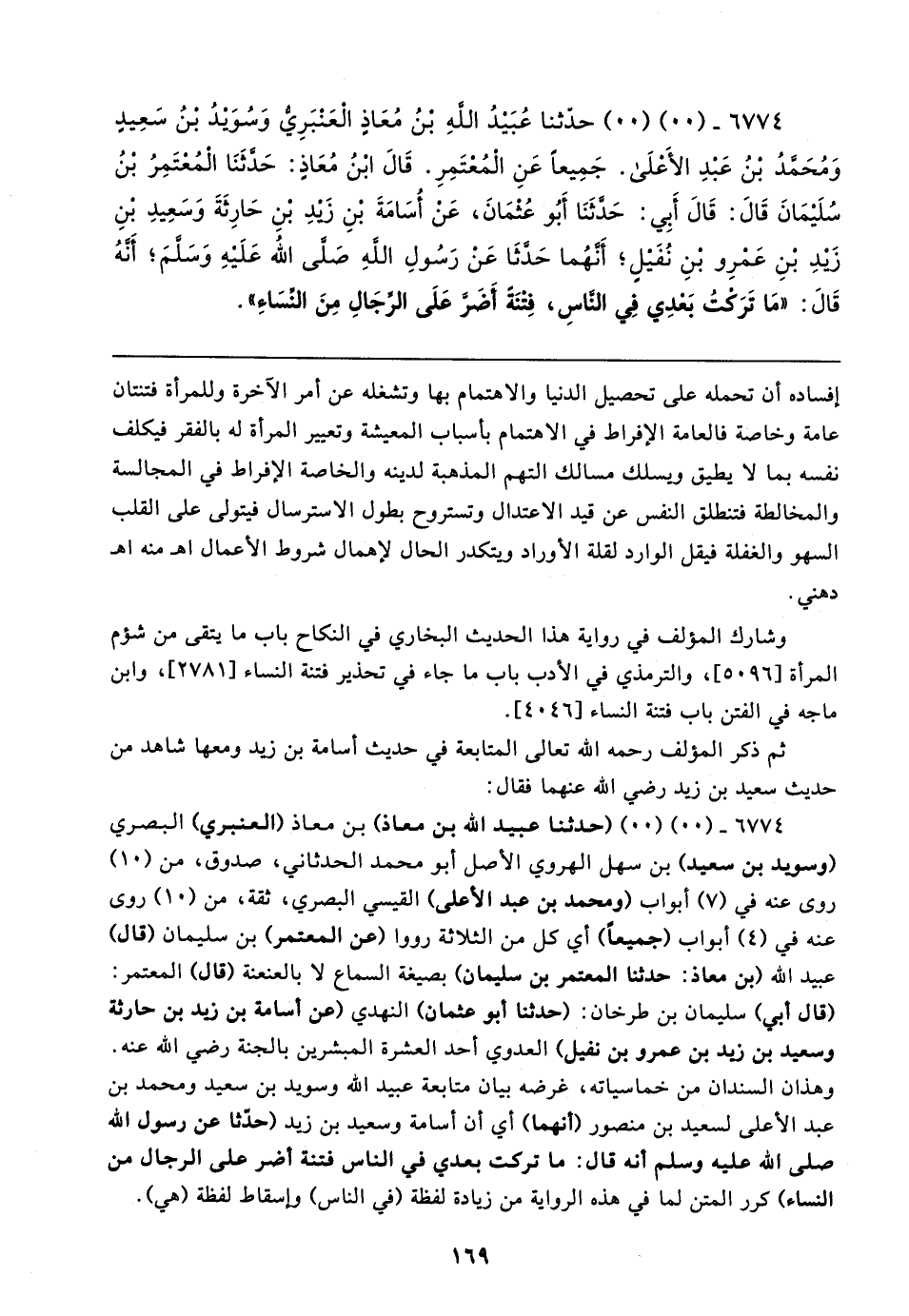 ٦٧٧٤ - (٠٠) (٠٠) حَدَّثَنَا عُبَيدُ اللهِ بْنُ مُعَاذٍ الْعَنْبَرِيُّ وَسُوَيدُ بْنُ سَعِيدٍ وَمُحَمَّدُ بْنُ عَبْدِ الأَعْلَى. جَمِيعًا عَنِ المُعْتَمِرِ. قَالَ ابْنُ مُعَاذٍ: حَدَّثَنَا الْمُعْتَمِرُ بْنُ سُلَيْمَانَ قَالَ: قَالَ أبي: حَدَّثَنَا أبُو عُثمَانَ، عَنْ أُسَامَةَ بْنِ زَيدِ بْنِ حَارِثَةَ وَسَعِيدِ بْنِ زَيْدِ بْنِ عَمْرِو بْنِ نُفَيلٍ؛ أَنهُما حَدَّثَا عَنْ رَسُولِ اللهِ صَلَّى الله عَلَيهِ وَسَلَّمَ؛ أَنَّهُ قَالَ: "مَا تَرَكتُ بَعدِي في النَّاسِ، فِتنَةً أَضَرَّ عَلَى الرِّجَالِ مِنَ النِّسَاءِ"
