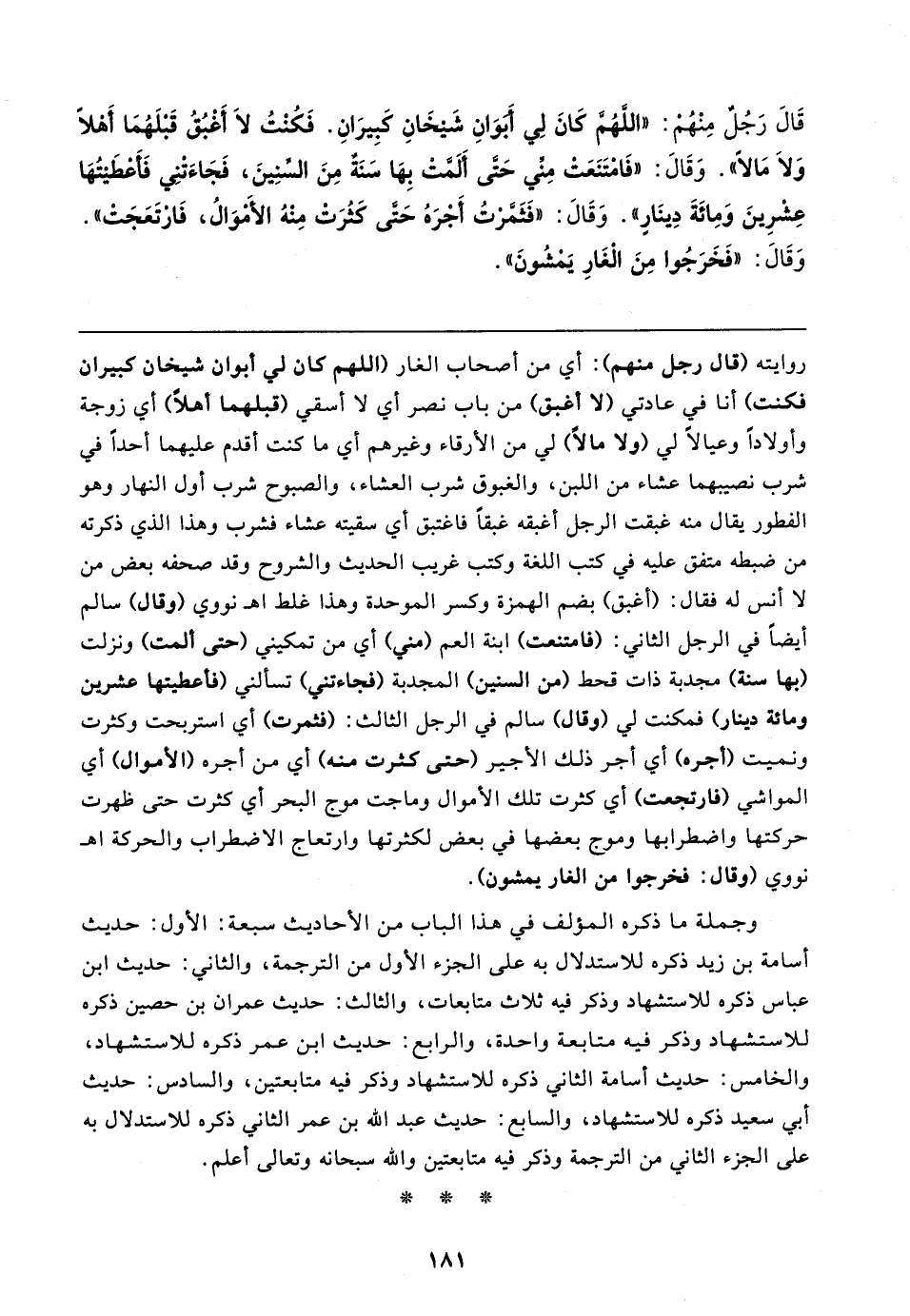 روايته (قال رجل منهم): أي من أصحاب الغار (اللهم كان لي أبوان شيخان كبيران فكنت) أنا في عادتي (لا أغبق) من باب نصر أي لا أسقي (قبلهما أهلًا) أي زوجة وأولادًا وعيالًا لي (ولا مالًا) لي من الأرقاء وغيرهم أي ما كنت أقدم عليهما أحدًا في شرب نصيبهما عشاء من اللبن، والغبوق شرب العشاء، والصبوح شرب أول النهار وهو الفطور يقال منه غبقت الرَّجل أغبقه غبقًا فاغتبق أي سقيته عشاء فشرب وهذا الذي ذكرته من ضبطه متفق عليه في كتب اللغة وكتب غريب الحديث والشروح وقد صحفه بعض من لا أنس له فقال: (أغبق) بضم الهمزة وكسر الموحدة وهذا غلط اه نووي (وقال) سالم أَيضًا في الرَّجل الثاني: (فامتنعت) ابنة العم (مني) أي من تمكيني (حتَّى ألمت) ونزلت (بها سنة) مجدبة ذات قحط (من السنين) المجدبة (فجاءتني) تسألني (فأعطيتها عشرين ومائة دينار) فمكنت لي (وقال) سالم في الرَّجل الثالث: (فثمرت) أي استربحت وكثرت ونميت (أجره) أي أجر ذلك الأجير (حتَّى كثرت منه) أي من أجره (الأموال) أي المواشي (فارتجعت) أي كثرت تلك الأموال وماجت موج البحر أي كثرت حتَّى ظهرت حركتها واضطرابها وموج بعضها في بعض لكثرتها وارتعاج الاضطراب والحركة اه نووي (وقال: فخرجوا من النَّار يمشون).
