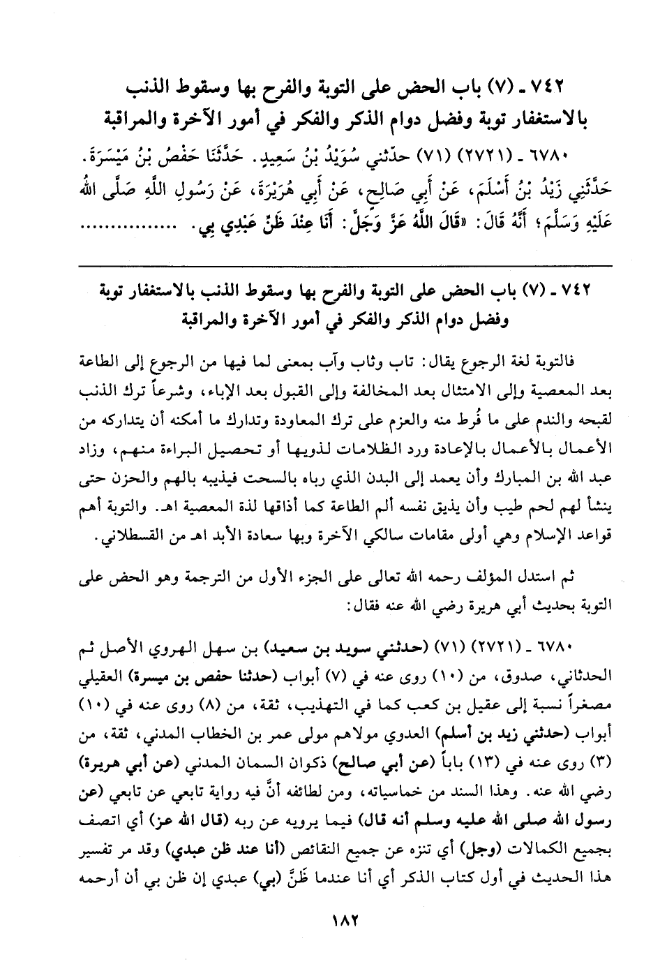 ٧٤٢ - (٧) باب الحض على التوبة والفرح بها وسقوط الذنب بالاستغفار توبة وفضل دوام الذكر والفكر في أمور الآخرة والمراقبة