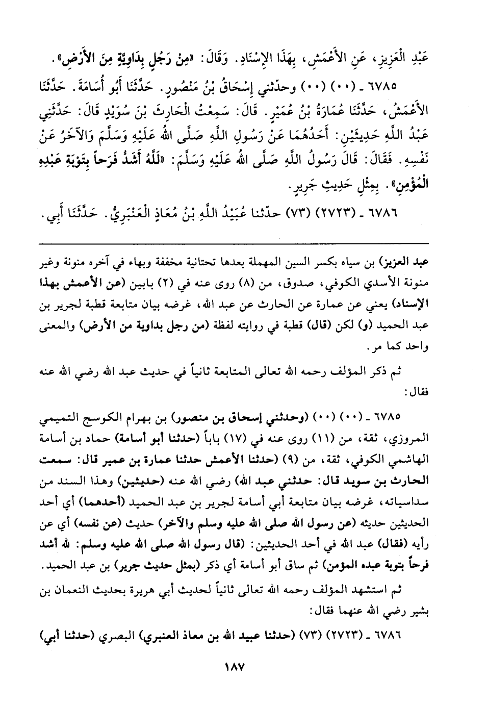 ٦٧٨٥ - (٠٠) (٠٠) (وحدثني إسحاق بن منصور) بن بهرام الكوسج التَّمِيمِيّ المروزي، ثِقَة، من (١١) روى عنه في (١٧) بابًا (حَدَّثَنَا أبو أسامة) حماد بن أسامة الهاشمي الكُوفيّ، ثِقَة، من (٩) (حَدَّثَنَا الأَعمش حَدَّثَنَا عمارة بن عمير قال: سمعت الحارث بن سويد قال: حَدَّثني عبد الله) رضي الله عنه (حديثين) وهذا السند من سداسياته، غرضه بيان متابعة أبي أسامة لجرير بن عبد الحميد (أحدهما) أي أحد الحديثين حديثه (عن رسول الله صلى الله عليه وسلم والآخر) حديث (عن نفسه) أي عن رأيه (فقال) عبد الله في أحد الحديثين: (قال رسول الله صلى الله عليه وسلم: لله أشد فرحًا بتوبة عبده المؤمن) ثم ساق أبو أسامة أي ذكر (بمثل حديث جرير) بن عبد الحميد. ثم استشهد المؤلف رحمه الله تعالى ثانيًا لحديث أبي هريرة بحديث النُّعمان بن بشير رضي الله عنهما فقال: