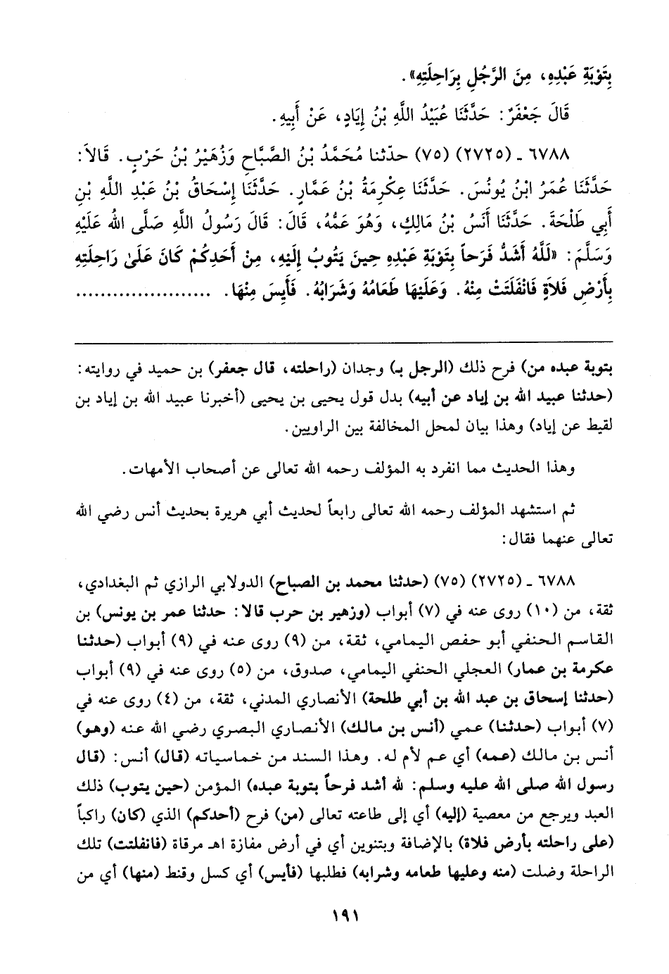 ٦٧٨٨ - (٢٧٢٥) (٧٥) حدّثنا مُحَمَّد بْنُ الصَّبَّاحِ وَزُهَيْرُ بْنُ حَرْبٍ. قَالَا: حَدَّثَنَا عُمَرُ ابْنُ يُونُسَ. حَدَّثَنَا عِكْرِمَةُ بْنُ عَمَّارٍ. حَدَّثَنَا إِسْحَاقُ بْنُ عَبْدِ اللهِ بْنِ أَبِي طَلْحَةَ. حَدَّثَنَا أَنَسُ بْنُ مالكِ، وَهُوَ عَمُّهُ، قَالَ: قَالَ رَسُولُ اللهِ صَلَّى الله عَلَيْهِ وسَلَّمَ: "لَلَّهُ أَشَدُّ فَرَحًا بِتَوْبَةِ عَبْدِهِ حِينَ يَتُوبُ إِلَيْهِ، مِنْ أَحَدِكُمْ كَانَ عَلَى رَاحِلَتِهِ بِأَرْضِ فَلَاةٍ فَانْفَلَتَتْ مِنْهُ. وَعَلَيهَا طَعَامُهُ وَشَرَابُهُ. فَأَيِسَ مِنْهَا