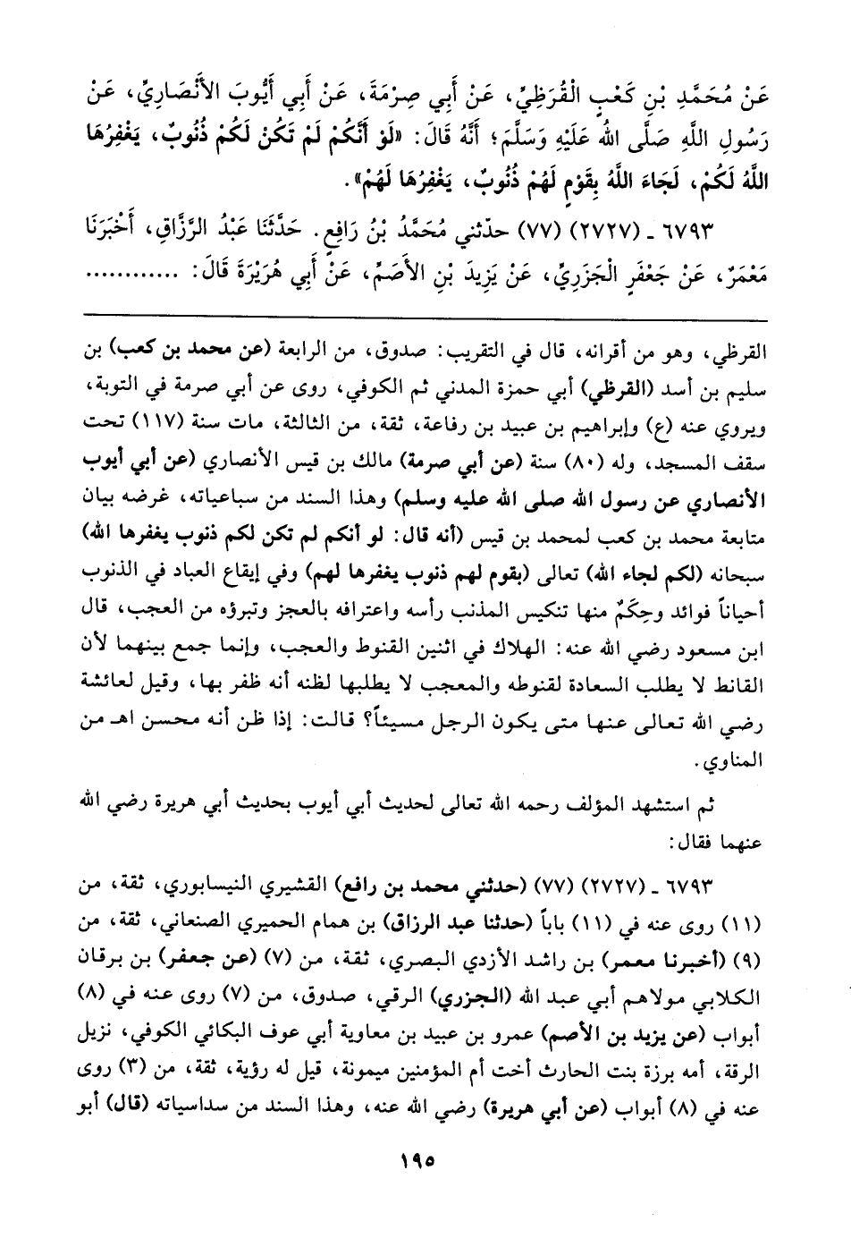 عَنْ مُحَمَّدِ بْنِ كَعْبٍ الْقُرَظِيِّ، عَنْ أَبِي صِرْمَةَ، عَنْ أَبِي أَيُّوبَ الأَنْصَارِيِّ، عَنْ رَسُولِ اللهِ صَلَّى الله عَلَيْهِ وسَلَّمَ؛ أَنَّهُ قَالَ: "لَوْ أنَّكُمْ لَمْ تَكُنْ لَكُمْ ذُنُوبٌ، يَغْفِرُهَا الله لَكُمْ، لَجَاءَ الله بِقَوْمٍ لَهُمْ ذُنُوبٌ، يَغفِرُهَا لَهُمْ".