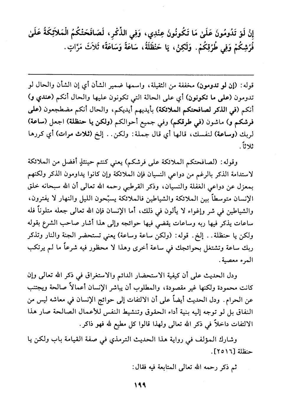 إِنْ لَوْ تَدُومُونَ عَلَى مَا تَكُونُونَ عِنْدِي، وَفِي الذِّكْرِ، لَصَافَحَتْكُمُ الْمَلَائِكَةُ عَلَى فُرُشِكُمْ وَفِي طُرُقِكُمْ. وَلَكِنْ، يَا حَنْظَلَةُ، سَاعَةً وَسَاعَةً" ثَلَاثَ مَرَّاتٍ