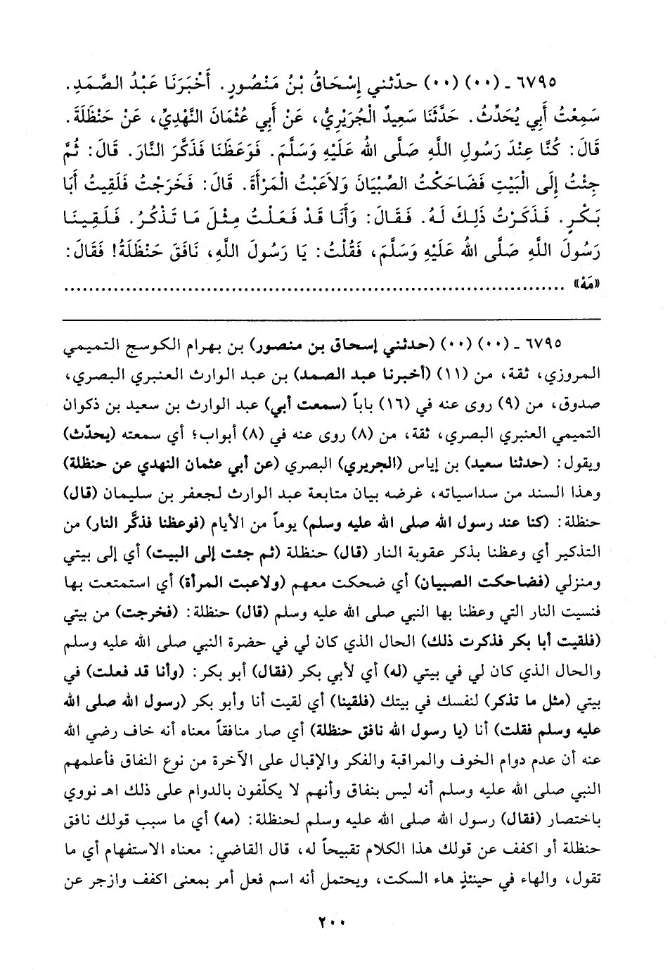 ٦٧٩٥ - (٠٠) (٠٠) (حدثني إسحاق بن منصور) بن بهرام الكوسج التَّمِيمِيّ المروزي، ثِقَة، من (١١) (أخبرنا عبد الصمد) بن عبد الوارث العنبري البَصْرِيّ، صدوق، من (٩) روى عنه في (١٦) بابًا (سمعت أبي) عبد الوارث بن سعيد بن ذكوان التَّمِيمِيّ العنبري البَصْرِيّ، ثِقَة، من (٨) روى عنه في (٨) أبواب؛ أي سمعته (يحدّث) ويقول: (حَدَّثَنَا سعيد) بن إياس (الجريري) البَصْرِيّ (عن أبي عثمان النهدي عن حنظلة) وهذا السند من سداسياته، غرضه بيان متابعة عبد الوارث لجعفر بن سليمان (قال) حنظلة: (كنا عند رسول الله صلى الله عليه وسلم) يومًا من الأيام (فوعظنا فذكَّر النَّار) من التذكير أي وعظنا بذكر عقوبة النَّار (قال) حنظلة (ثم جئت إلى البيت) أي إلى بيتي ومنزلي (فضاحكت الصبيان) أي ضحكت معهم (ولاعبت المرأة) أي استمتعت بها فنسيت النَّار التي وعظنا بها النَّبِيّ صلى الله عليه وسلم (قال) حنظلة: (فخرجت) من بيتي (فلقيت أَبا بكر فذكرت ذلك) الحال الذي كان لي في حضرة النَّبِيّ صلى الله عليه وسلم والحال الذي كان لي في بيتي (له) أي لأبي بكر (فقال) أبو بكر: (وأنا قد فعلت) في بيتي (مثل ما تذكر) لنفسك في بيتك (فلقينا) أي لقيت أنا وأبو بكر (رسول الله صلى الله عليه وسلم فقلت) أنا (يَا رسول الله نافق حنظلة) أي صار منافقًا معناه أنَّه خاف رضي الله عنه أن عدم دوام الخوف والمراقبة والفكر والإقبال على الآخرة من نوع النفاق فأعلمهم النَّبِيّ صلى الله عليه وسلم أنَّه ليس بنفاق وأنهم لا يكلّفون بالدوام على ذلك اه نووي باختصار (فقال) رسول الله صلى الله عليه وسلم لحنظلة: (مه) أي ما سبب قولك نافق حنظلة أو اكفف عن قولك هذا الكلام تقبيحًا له، قال القاضي: معناه الاستفهام أي ما تقول، والهاء في حينئذٍ هاء السكت، ويحتمل أنَّه اسم فعل أمر بمعنى اكفف وازجر عن
