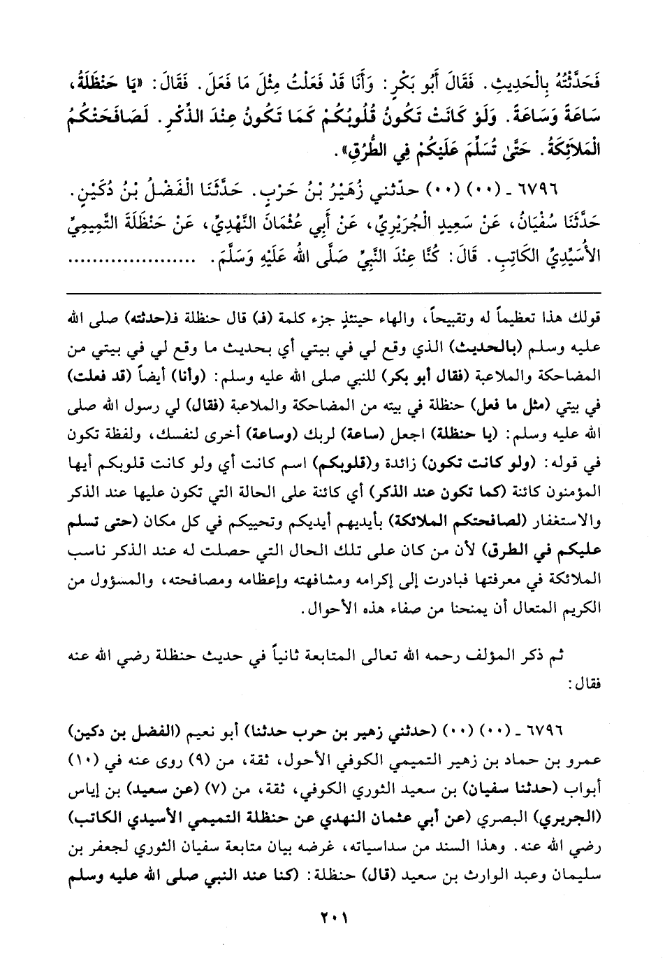 ٦٧٩٦ - (٠٠) (٠٠) (حَدَّثني زهير بن حرب حَدَّثَنَا) أبو نعيم (الفضل بن دكين) عمرو بن حماد بن زهير التَّمِيمِيّ الكُوفيّ الأحول، ثِقَة، من (٩) روى عنه في (١٠) أبواب (حَدَّثَنَا سفيان) بن سعيد الثَّوريّ الكُوفيّ، ثِقَة، من (٧) (عن سعيد) بن إياس (الجريري) البَصْرِيّ (عن أبي عثمان النهدي عن حنظلة التَّمِيمِيّ الأسيدي الكاتب) رضي الله عنه. وهذا السند من سداسياته، غرضه بيان متابعة سفيان الثَّوريّ لجعفر بن سليمان وعبد الوارث بن سعيد (قال) حنظلة: (كنا عند النَّبِيّ صلى الله عليه وسلم