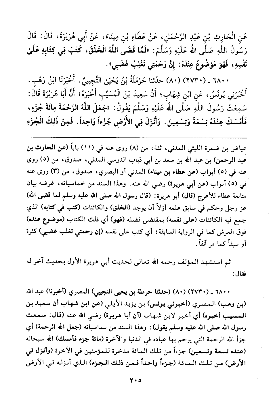 عَنِ الْحَارِثِ بْنِ عَبْدِ الرَّحْمَنِ، عَنْ عَطَاءِ بْنِ مِينَاءَ، عَنْ أَبِي هُرَيْرَةَ، قَالَ: قَالَ رَسُولُ اللهِ صَلَّى الله عَلَيْهِ وَسَلَّمَ: "لَمَّا قَضَى الله الْخَلْقَ، كَتَبَ في كِتَابِهِ َعَلَى نَفْسِهِ، فَهُوَ مَوْضُوعٌ عِنْدَهُ: إِنَّ رَحْمَتِي تَغلِبُ غَضَبِي".