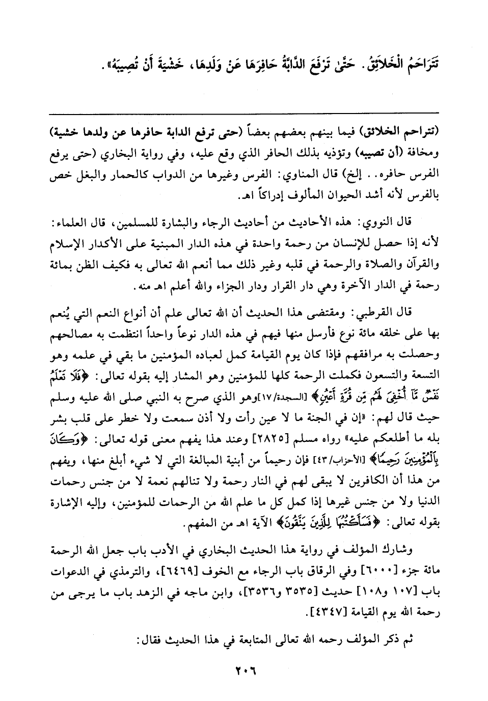 تَتَرَاحَمُ الْخَلَائقُ. حَتَّى تَرْفَعَ الدَّابَّةُ حَافِرَهَا عَنْ وَلَدِهَا، خَشيَةَ أَنْ تُصِيبَهُ"